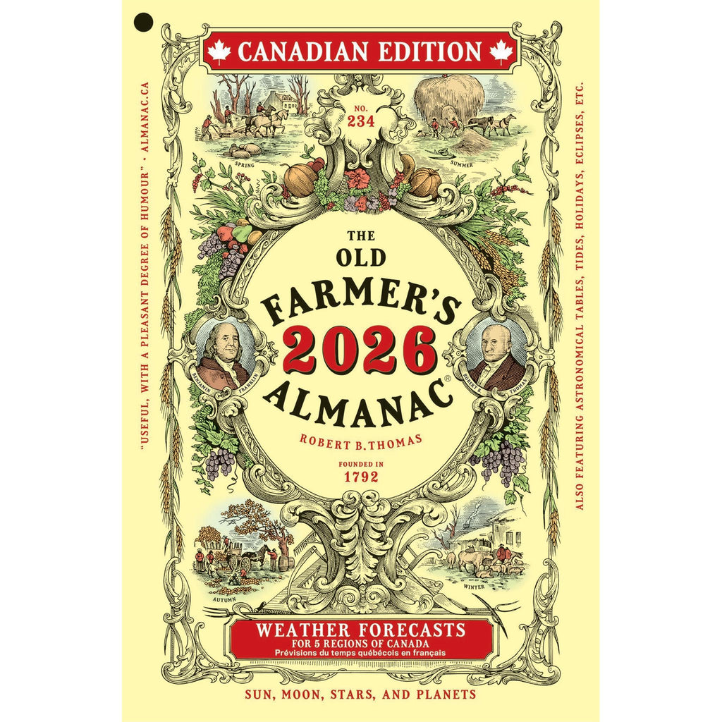 L'Almanach du vieux fermier, édition canadienne : comprend : des prévisions météorologiques canadiennes (y compris en français pour le Québec), des articles sur le Canada rédigés par des auteurs canadiens, des données astronomiques d'Ottawa dans le calendrier Sky Watch, les jours fériés et les commémorations canadiennes, un tableau des gelées et des conditions climatiques avec les localités canadiennes. 96 pages en couleur.