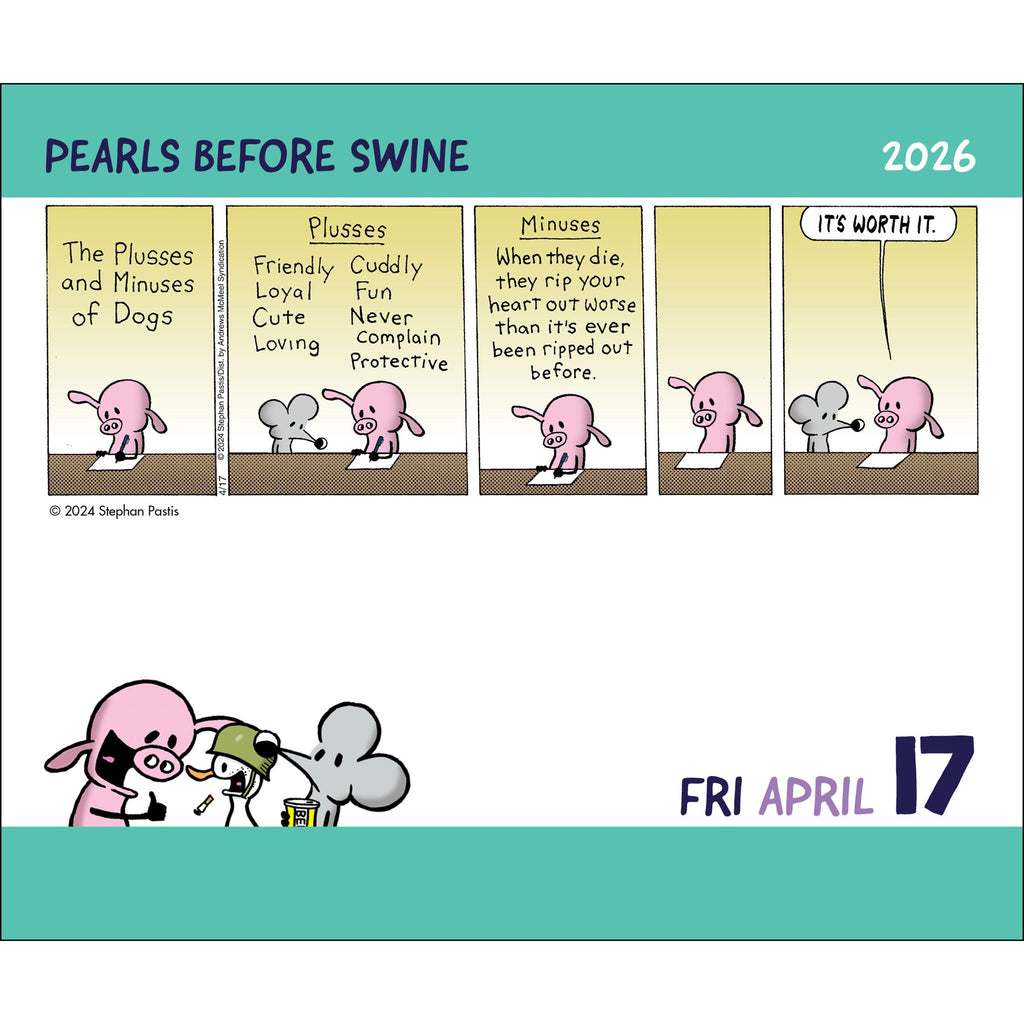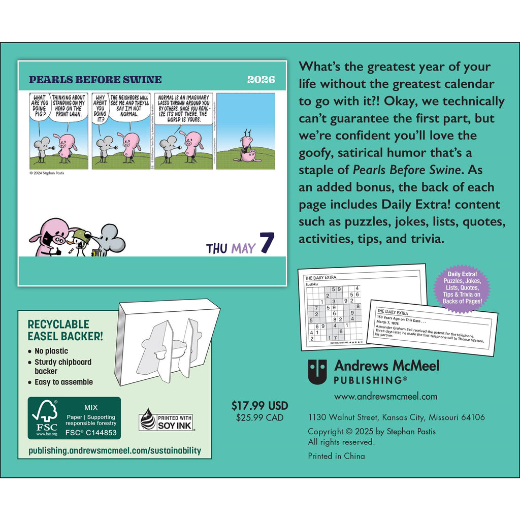 Avec son humour décalé et ses jeux de mots extravagants qui ont fait de Pearls Before Swine l'une des bandes dessinées les plus drôles du moment, chaque page de ce calendrier quotidien présente une BD Pearls Before Swine en couleurs pour vous faire rire toute l'année. En bonus, le verso de chaque page propose du contenu supplémentaire quotidien : jeux, blagues, listes, citations, activités, conseils et anecdotes. Caractéristiques : Format : 13,7 x 11,4 cm. Sans plastique à usage unique. Support chevalet en carton recyclable pour une présentation sur un bureau ou une table. Imprimé sur du papier certifié FSC® avec de l'encre à base de soja. Pages détachables en couleurs. Contenu bonus quotidien au verso de chaque page. Date et heure indiquées sur chaque page. 365 pages quotidiennes. Jours fériés et commémorations officiels. Une nouvelle BD chaque jour.