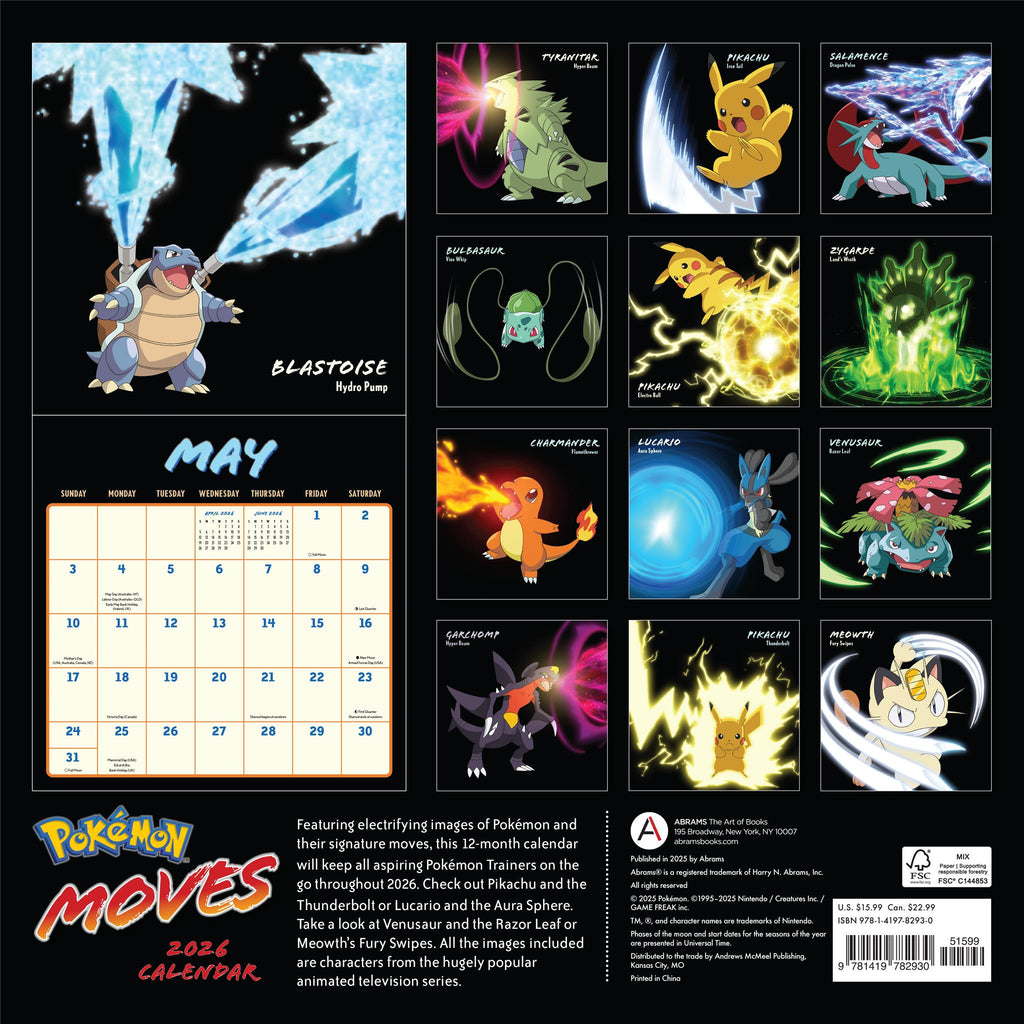 Avec ses illustrations électrisantes de Pokémon et de leurs attaques emblématiques, ce calendrier de 12 mois accompagnera tous les apprentis Dresseurs Pokémon tout au long de l'année 2026. Découvrez Pikachu et son attaque Tonnerre, ou Lucario et son Aura Sphère. Admirez Florizarre et son Tranch'Herbe, ou encore Miaouss et ses Coups Furieux. Toutes les illustrations sont issues de la série animée culte. Caractéristiques : 30,5 cm x 30,5 cm (30,5 cm x 61 cm ouvert). Imprimé sur papier certifié FSC® avec des encres à base de soja. Planification de septembre à décembre 2025. Couvre la période de janvier à décembre 2026. Grand espace pour vos notes, rendez-vous et rappels. Jours fériés et commémorations officiels. Phases de la lune (UTC). Nom de chaque Pokémon et son attaque emblématique.