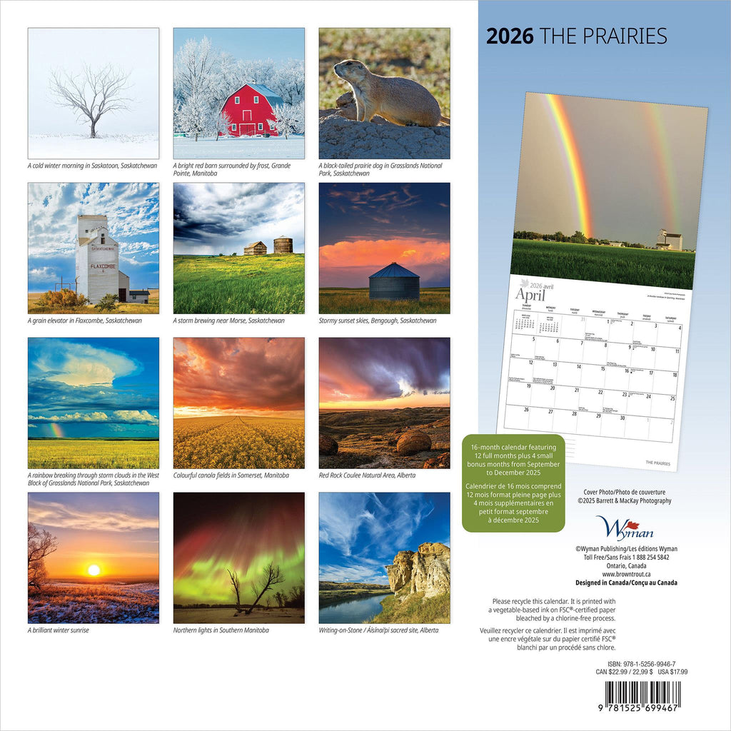 Le Manitoba et la Saskatchewan regorgent de paysages uniques et magnifiques. Des vastes plaines vallonnées aux terres agricoles verdoyantes, en passant par des vallées fluviales et des lacs pittoresques, admirez 13 superbes images de ces deux provinces des Prairies au fil des saisons. Ce calendrier mural carré, en anglais, est idéal pour apporter de magnifiques photos et illustrations à votre intérieur, ou à offrir à vos proches. Ce calendrier de 30,5 x 30,5 cm (12 x 12 pouces) se déplie pour former un grand calendrier de 61 cm (24 pouces) qui embellira votre mur avec de superbes images de votre passion. Daté de janvier à décembre, il comprend également une page bonus de mini-calendrier de septembre à décembre de l'année précédente pour vous aider à anticiper vos projets. Les grilles mensuelles offrent suffisamment d'espace pour noter vos tâches et rendez-vous quotidiens, et incluent tous les principaux jours fériés américains et internationaux. Vous pouvez l'acheter en toute tranquillité, car tous ses composants sont recyclables.