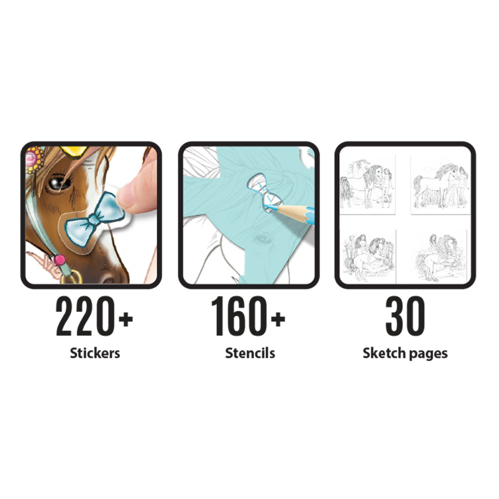 Ce kit artistique allie la créativité de la mode à la beauté du monde équestre. Utilisez plus de 160 pochoirs et plus de 220 autocollants pour concevoir des tenues élégantes pour les cavaliers et de superbes accessoires pour les chevaux. Grâce aux 30 pages de croquis avec des modèles pré-imprimés, vous pouvez combiner vêtements et ornements pour créer les looks équestres de vos rêves.
