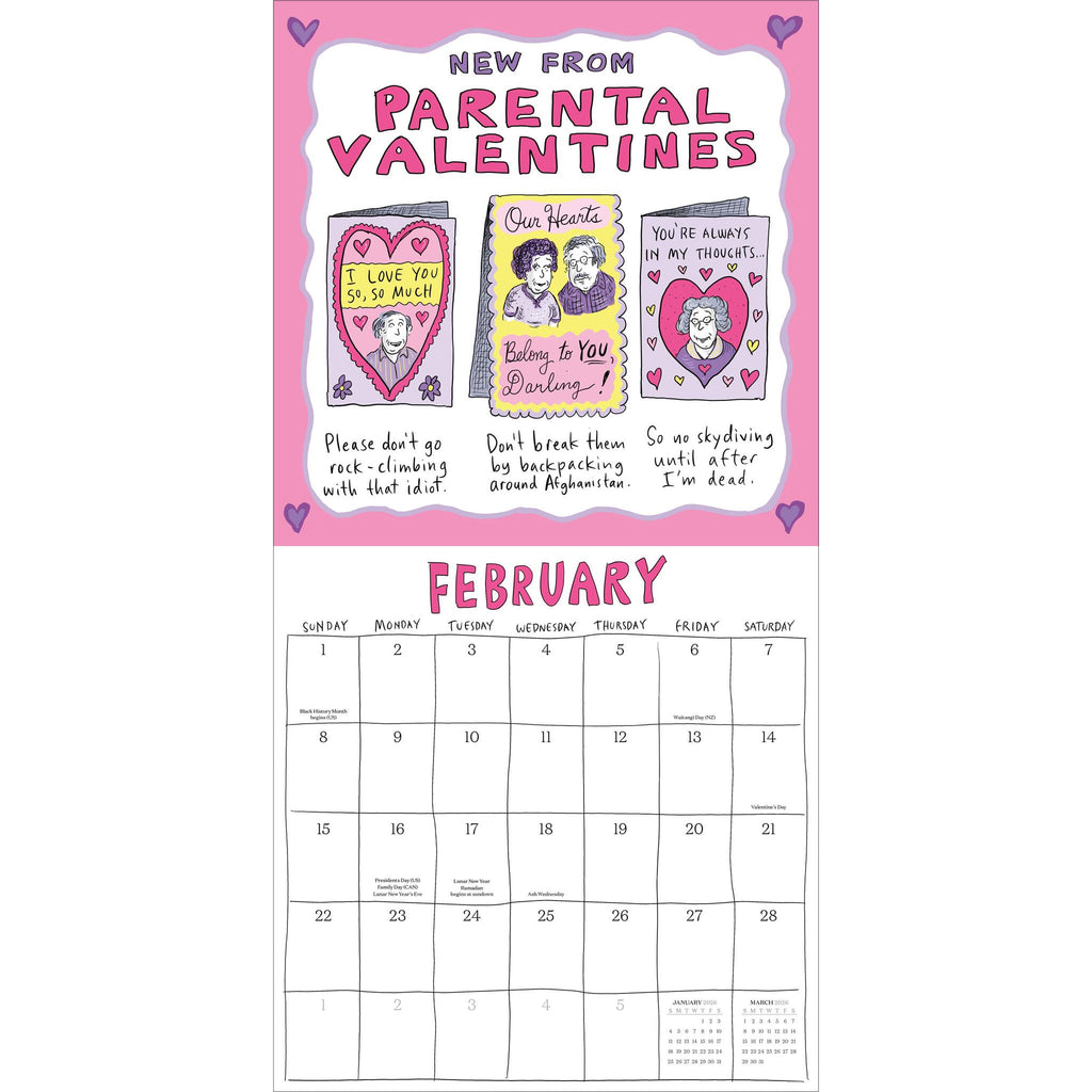 Chaque mois propose l'une des bandes dessinées délicieusement drôles (et parfois trop réalistes) de Roz Chast, comme « La Saint-Valentin des parents » en février, « Botticelli sur la couverture de plage » en juillet et « Le dernier Thanksgiving » en novembre.
