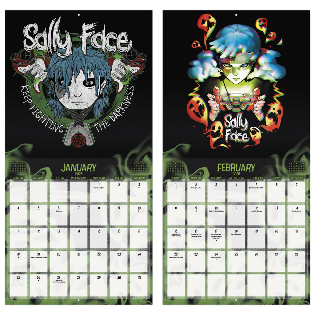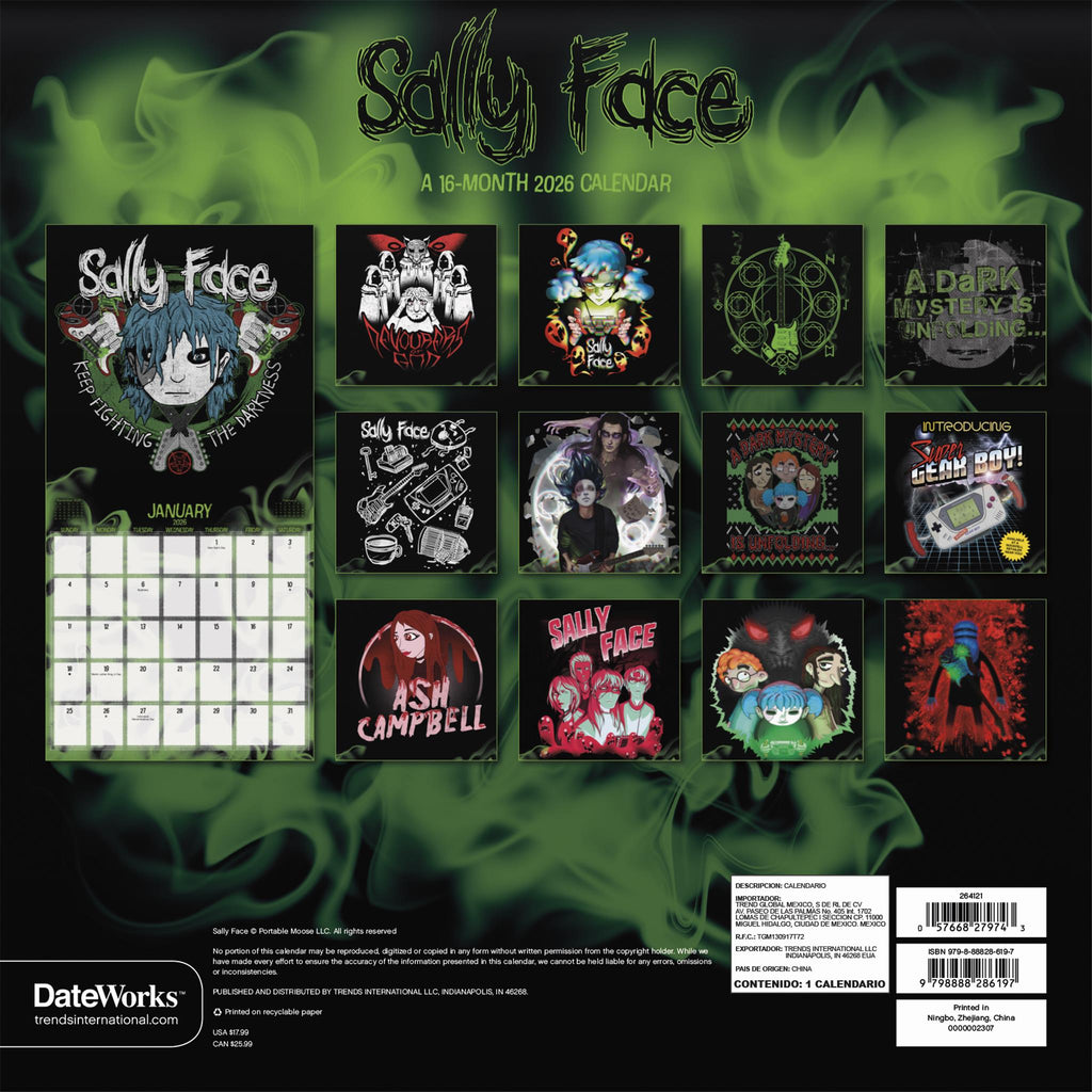 Un sombre mystère se dévoile. Le jeu d'aventure indépendant acclamé Sally Face suit un garçon au visage prothétique qui utilise sa console portable pour communiquer avec les morts et découvrir leurs histoires. Une menace sinistre plane sur sa petite ville. Explorez les illustrations emblématiques du jeu dans le calendrier Sally Face 2026, mais ne vous laissez pas perturber par l'horreur. Ce calendrier mural de seize mois propose des pages mensuelles de janvier à décembre 2026, ainsi qu'une page regroupant les quatre derniers mois de 2025. Chaque page mensuelle inclut les jours fériés et les phases de la lune, avec suffisamment d'espace pour noter vos tâches et rendez-vous et ainsi vous aider à rester organisé. Il comprend 13 images de haute qualité imprimées sur du papier premium certifié FSC (Forest Stewardship Council). Idéal pour décorer vos murs, tableaux d'affichage ou panneaux de liège, à la maison, à l'école ou au bureau.