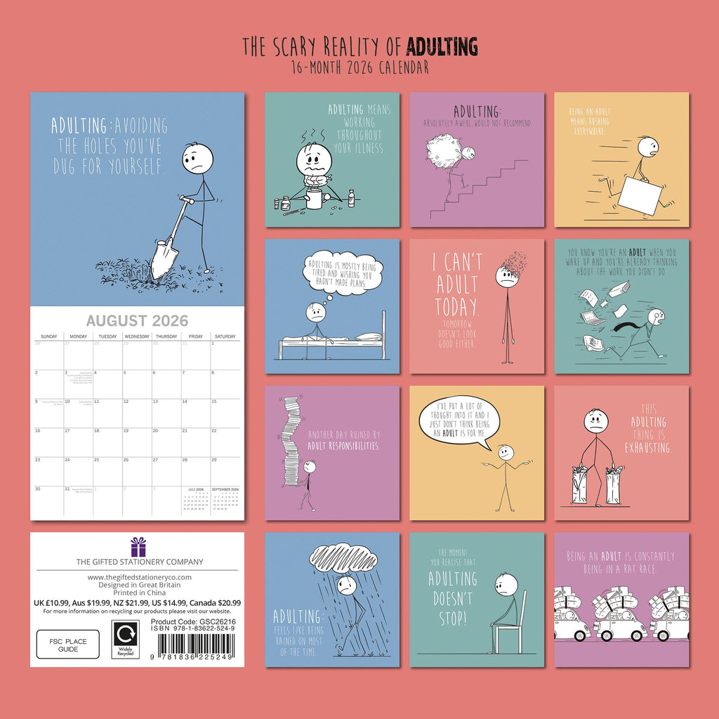 Ce calendrier 2026 humoristique et de grande qualité est idéal pour les jeunes adultes. Chaque mois présente une scène amusante illustrant les réalités parfois difficiles de la vie adulte, tandis que sa grande grille est parfaite pour la maison et le bureau, avec suffisamment d'espace pour noter les anniversaires et les petits mots. Il inclut une liste complète des dates des fêtes religieuses et des festivals du monde entier. 100 % sans plastique et recyclable. Sans film rétractable.
