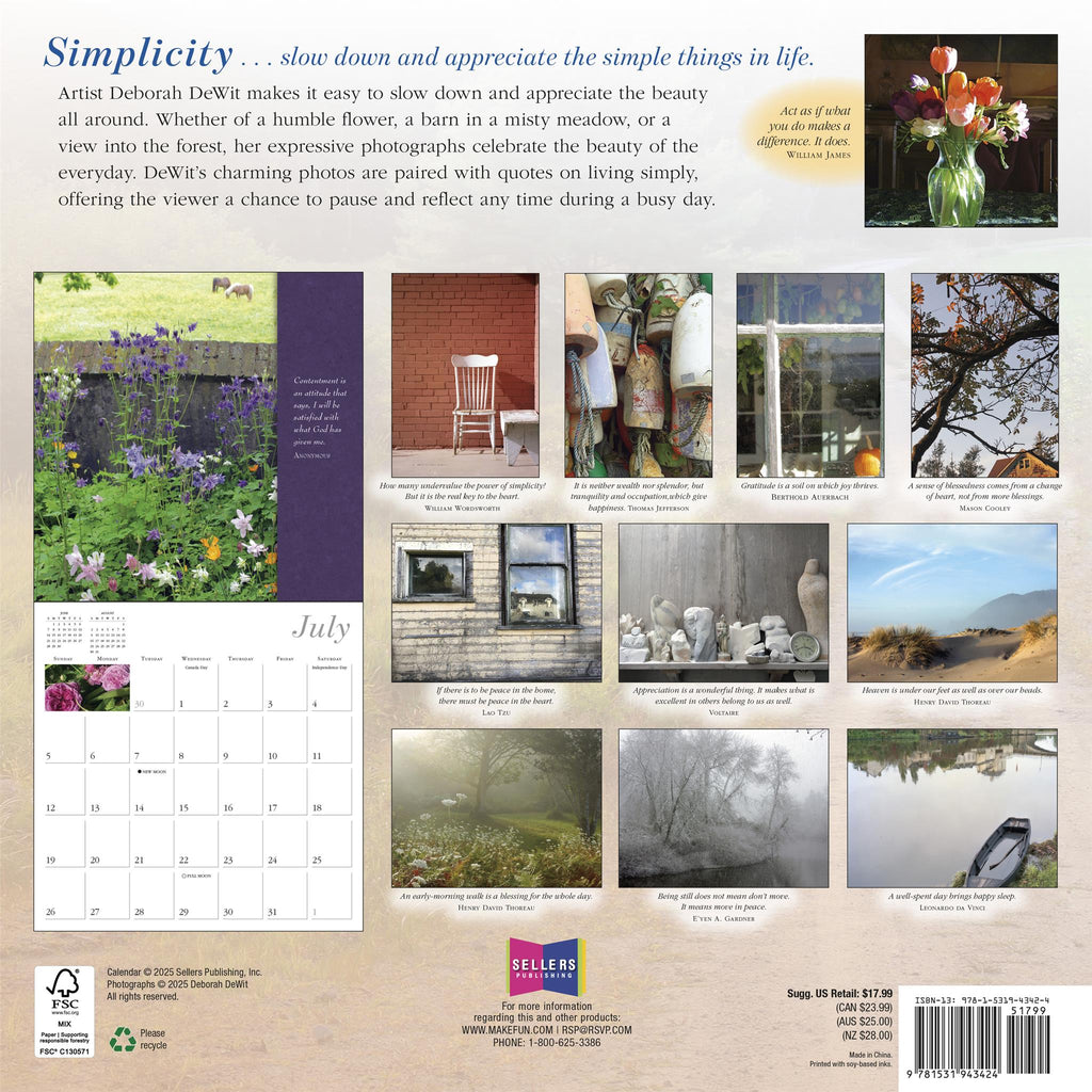 L'artiste Deborah DeWit trouve la beauté dans les rythmes simples et ordinaires de la vie. Ses photographies expressives célèbrent les vertus du quotidien. Accompagnées de citations sur la simplicité, ses images charmantes offrent au spectateur une pause bienvenue pour méditer à tout moment de la journée.