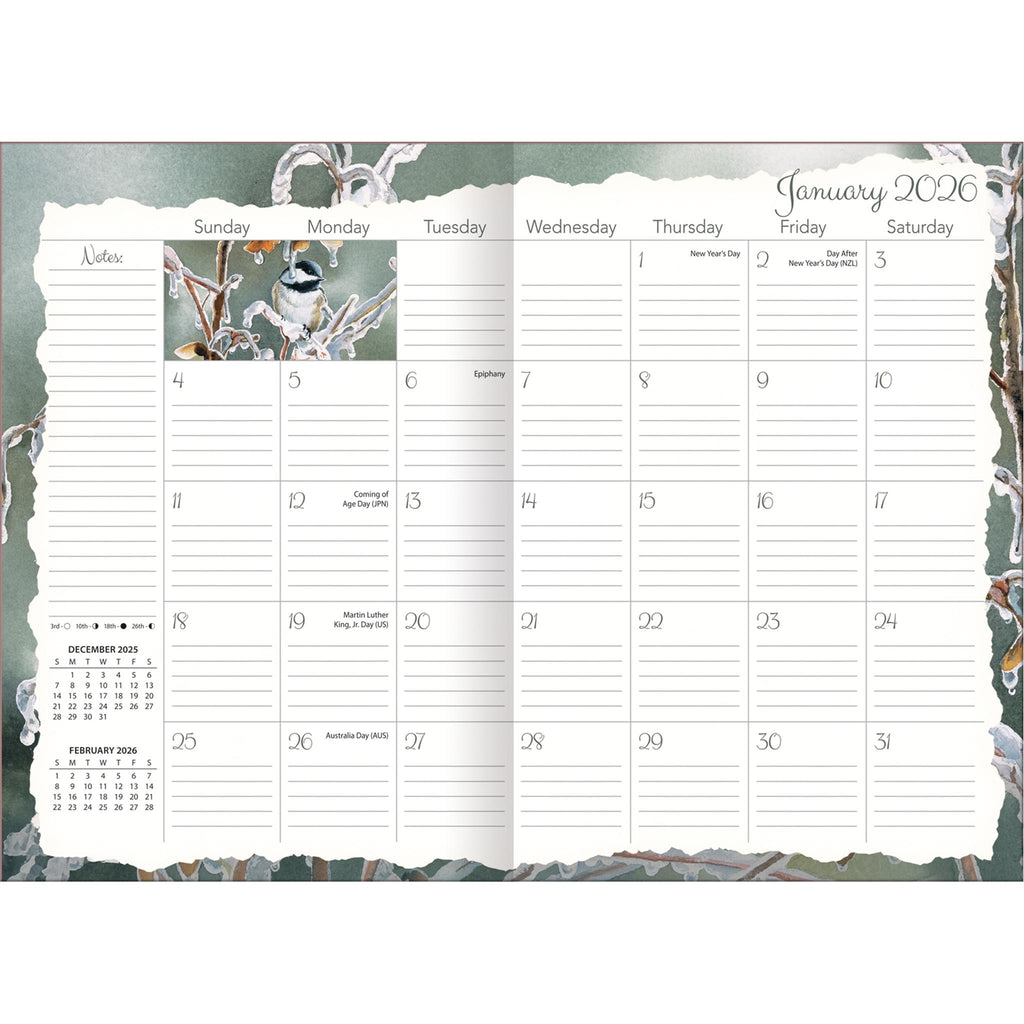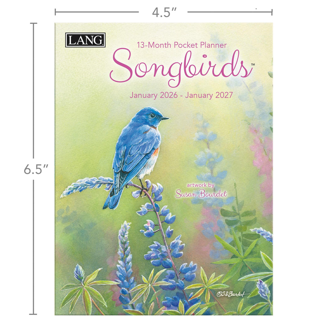 L'agenda de poche mensuel Songbirds 2026 présente chaque mois des illustrations d'oiseaux joyeux, célèbres pour leurs couleurs et leurs chants, réalisées par Susan Bourdet, dans un format portable de 13 mois qui se glisse dans n'importe quelle poche ou sac à main.