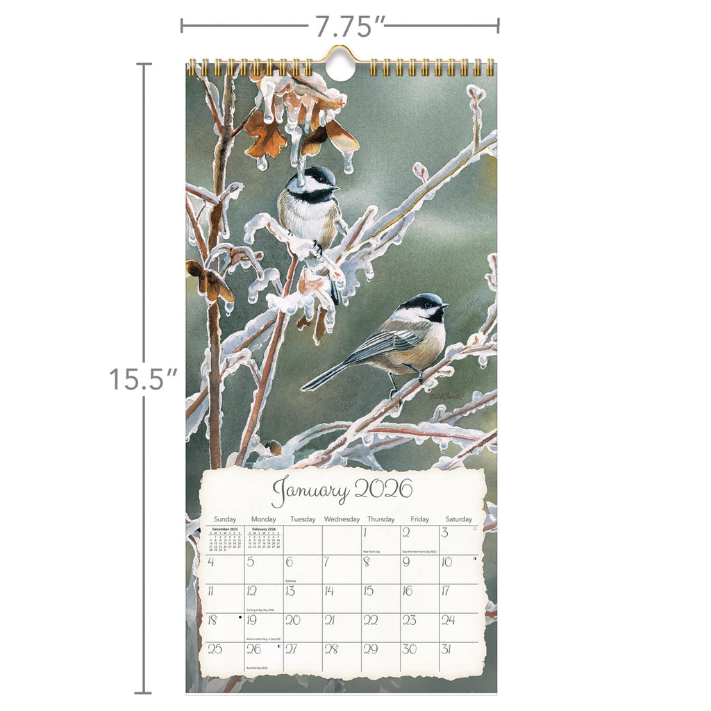Le calendrier mural vertical Songbirds 2026 présente chaque mois une illustration de joyeux oiseaux chanteurs réalisée par Susan Bourdet, dans un format vertical compact. Les calendriers muraux verticaux LANG sont imprimés sur du papier gaufré lin, reliés par une spirale avec crochet de suspension et accompagnés d'une couverture cadeau assortie.