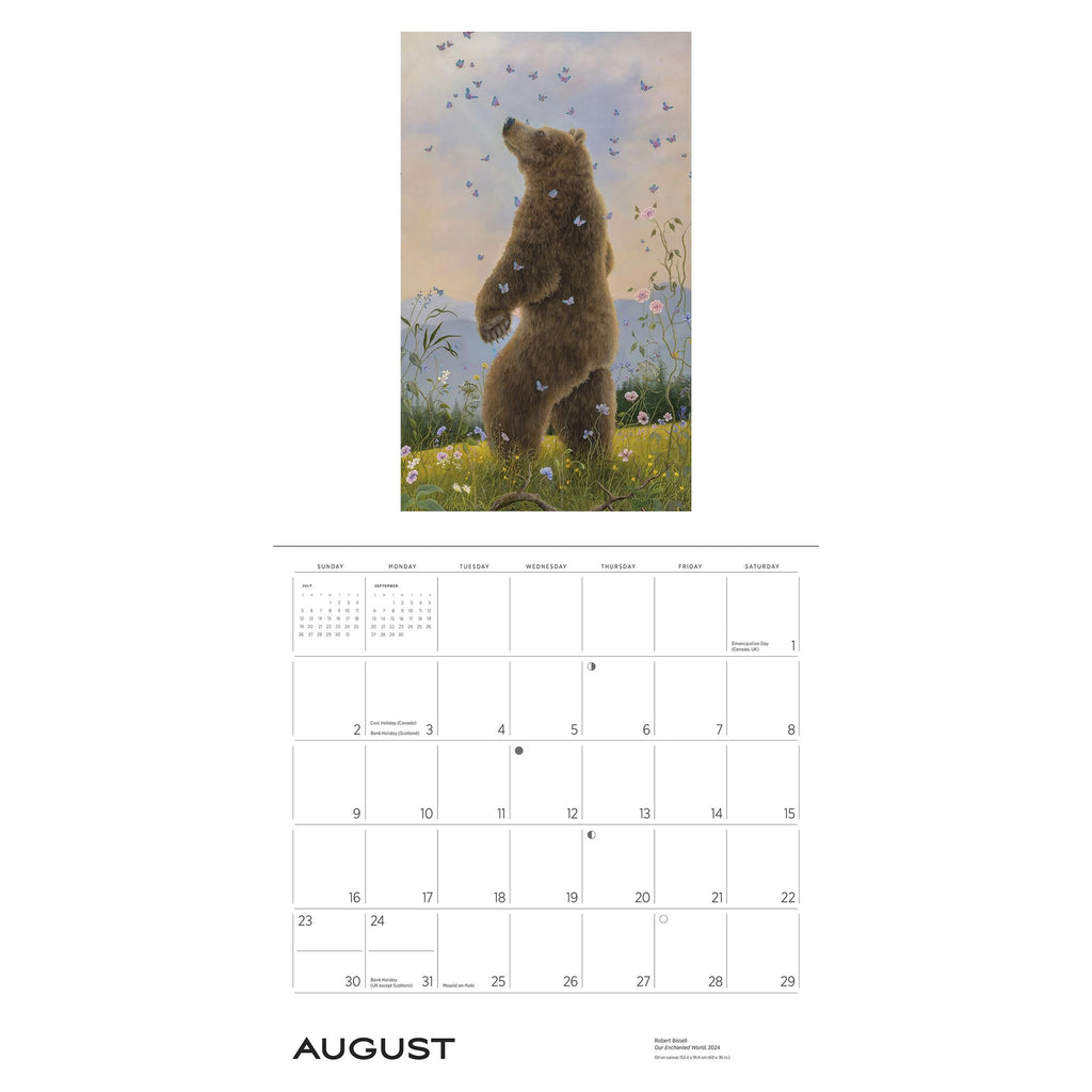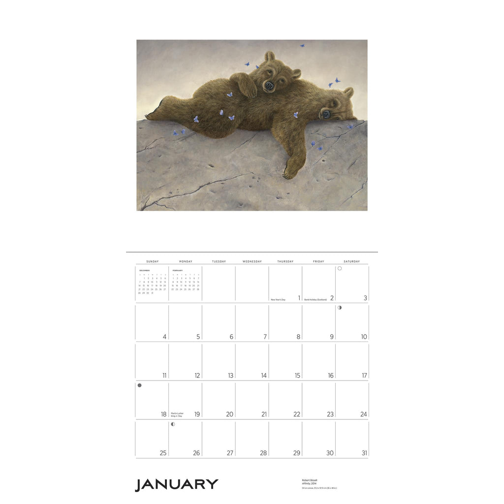 Contemplatifs et curieux, les ours de l'univers de Robert Bissell sont des méditations ludiques sur la vie intérieure de ces créatures et, par extension, de l'être humain. Qu'ils soient plongés dans la sérénité d'une forêt de séquoias ou fascinés par un tourbillon de papillons, les ours nous attirent et nous invitent à nous percevoir, une fois encore, comme faisant partie intégrante de la nature, nos esprits interconnectés dans ce monde multidimensionnel. Bissell a grandi dans une ferme de la campagne anglaise, entouré d'animaux et de paysages panoramiques. Au cours de ses débuts comme photographe et directeur artistique, il a acquis une compréhension profonde de la condition humaine avant de se consacrer pleinement aux beaux-arts : « Il est essentiel pour moi que mon travail favorise une compréhension intégrale de notre monde, contribue à l'éveil des consciences et transforme la vie des gens. » Laissez-vous guider tout au long de l'année par les ours zoomorphes de Bissell grâce à ce calendrier orné de 12 peintures apaisantes.
