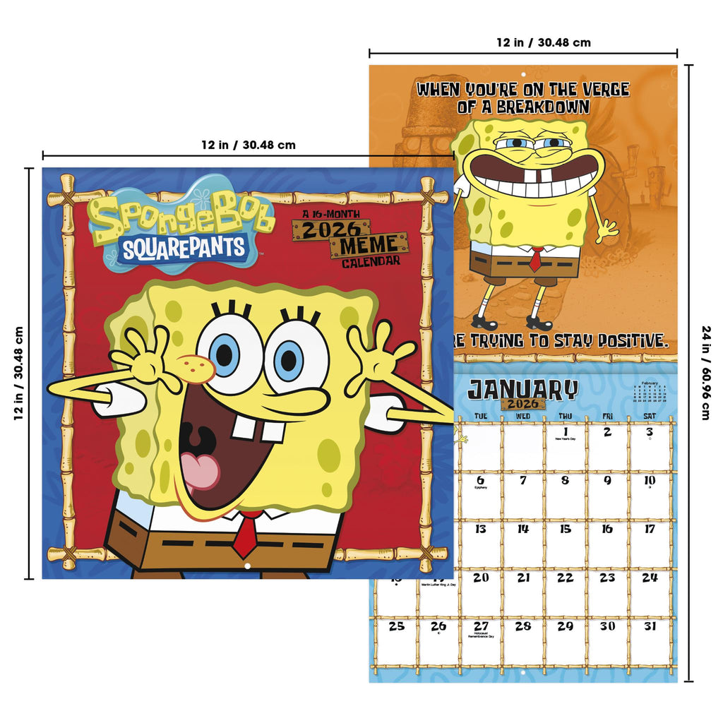 Le calendrier Bob l'Éponge 2026 est parfaitement adapté à la décoration murale de votre maison. Bob l'Éponge et Gary, Patrick l'Étoile de Mer, Carlo Tentacule, Sally l'Écureuil et bien d'autres partagent leurs mésaventures aquatiques dans ce calendrier illustré de la série animée. Ce calendrier mural de seize mois comprend des pages mensuelles de janvier à décembre 2026, ainsi qu'une page regroupant les quatre derniers mois de 2025. Chaque page mensuelle inclut les jours fériés et les phases de la lune, avec suffisamment d'espace pour noter vos tâches et rendez-vous et ainsi vous aider à rester organisé. Il présente 13 images de haute qualité imprimées sur du papier premium certifié FSC (Forest Stewardship Council). Idéal pour décorer un mur, un tableau en liège ou un tableau d'affichage à la maison, à l'école ou au bureau.