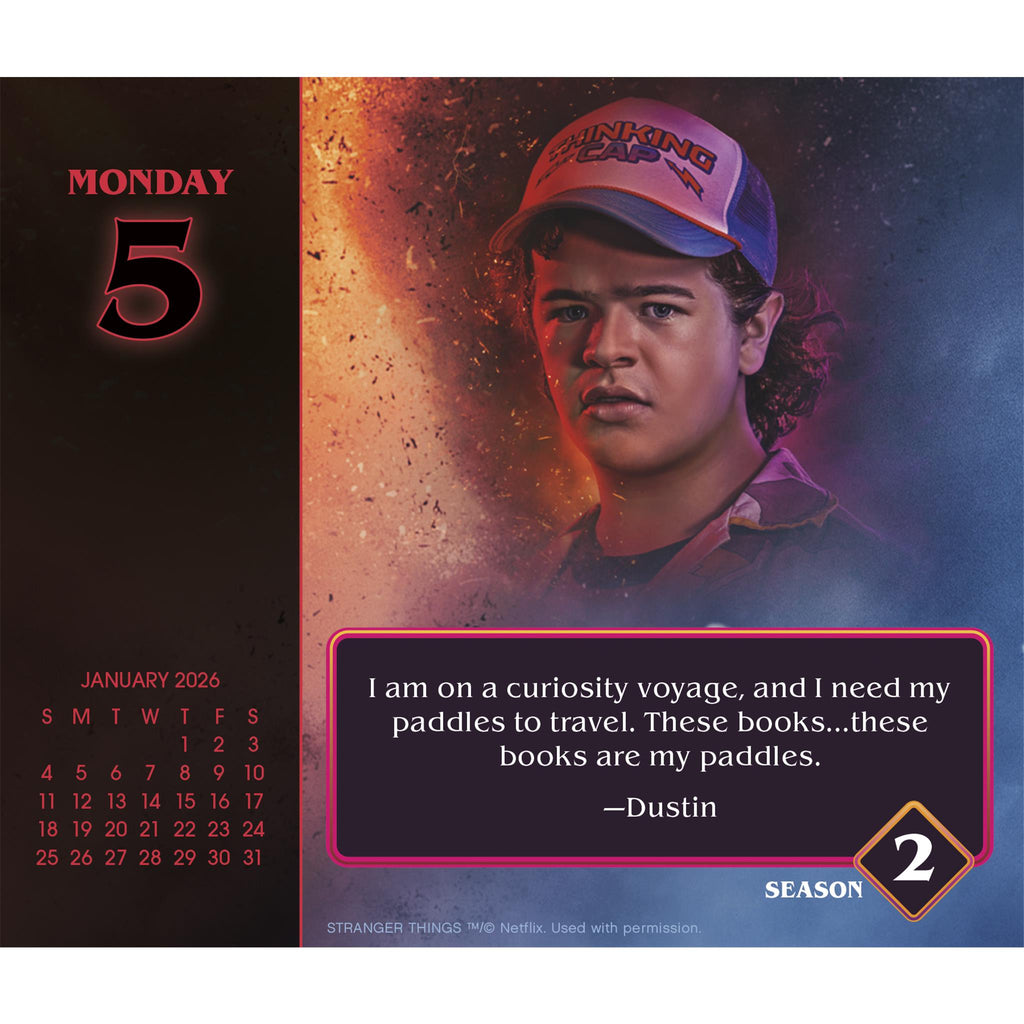 Dans Hawkins, dans l'Indiana des années 80, un groupe d'amis est témoin d'étranges phénomènes surnaturels, de disparitions et d'activités gouvernementales secrètes. Plongez dans leur univers grâce aux citations et images de la série à succès Stranger Things dans ce calendrier 2026. Le cadeau idéal pour un proche, ou pour vous-même. Ce calendrier, présenté dans une case, contient plus de 300 pages détachables en couleur, avec des illustrations uniques pour chaque jour de l'année (les pages du week-end regroupent les samedis et dimanches). Il indique les jours fériés et les phases de la lune pour vous aider à vous organiser. Un chevalet écologique et sans plastique est inclus pour une présentation facile sur votre bureau, votre table ou une étagère, à la maison, à l'école ou au bureau.