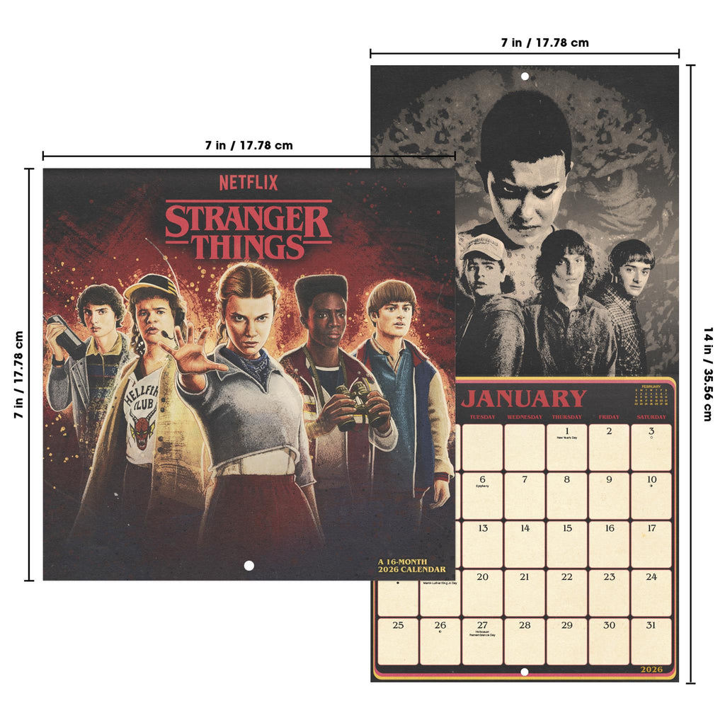 Dans les années 80 à Hawkins, dans l'Indiana, un groupe d'amis est témoin d'étranges phénomènes surnaturels, de disparitions et d'activités gouvernementales secrètes. Plongez dans leur univers grâce aux images de la série à succès Stranger Things dans le mini-calendrier 2026, au format idéal pour passer le portail vers l'Upside Down. Parfait pour les petits espaces, ce mini-calendrier de 16 mois comprend des pages mensuelles de janvier à décembre 2026, ainsi qu'une page regroupant les quatre derniers mois de 2025. Chaque page mensuelle inclut les jours fériés et les phases de la lune, avec des cases journalières pour noter vos tâches et rendez-vous et vous aider à rester organisé. Il contient 13 images de haute qualité dans un format compact, imprimées sur du papier premium certifié FSC (Forest Stewardship Council). Idéal pour décorer les casiers d'école, les camping-cars, les petits bureaux et les chambres d'étudiant.