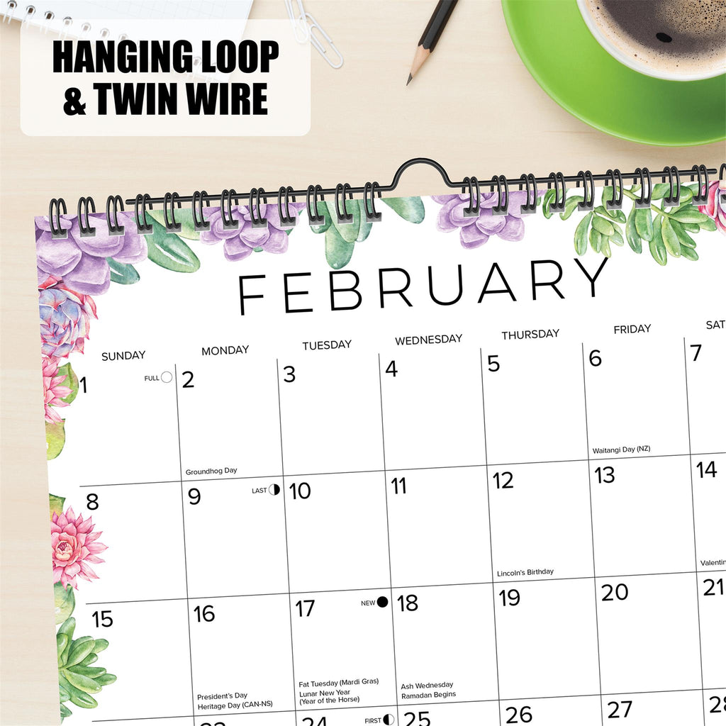 Que vous souhaitiez embellir votre bureau ou ajouter une touche artistique à votre mur, ces calendriers à spirales ornés de succulentes sont faits pour vous. Ces calendriers de 30 x 30 cm (12 x 12 pouces) présentent les mois précédents et suivants, avec des illustrations mensuelles et de larges cases vierges offrant un espace généreux pour vous aider à planifier et à rester organisé(e) tout au long de l'année. La fonction mensuelle de ce calendrier vous permet de noter vos rendez-vous, réunions et idées du jour pour une planification efficace de l'année. Vivez pleinement votre vie ! Un anneau métallique robuste assure une fixation murale stable et esthétique. Ce calendrier inclut également les phases de la lune (heure centrale des États-Unis) et les jours fériés américains et internationaux.