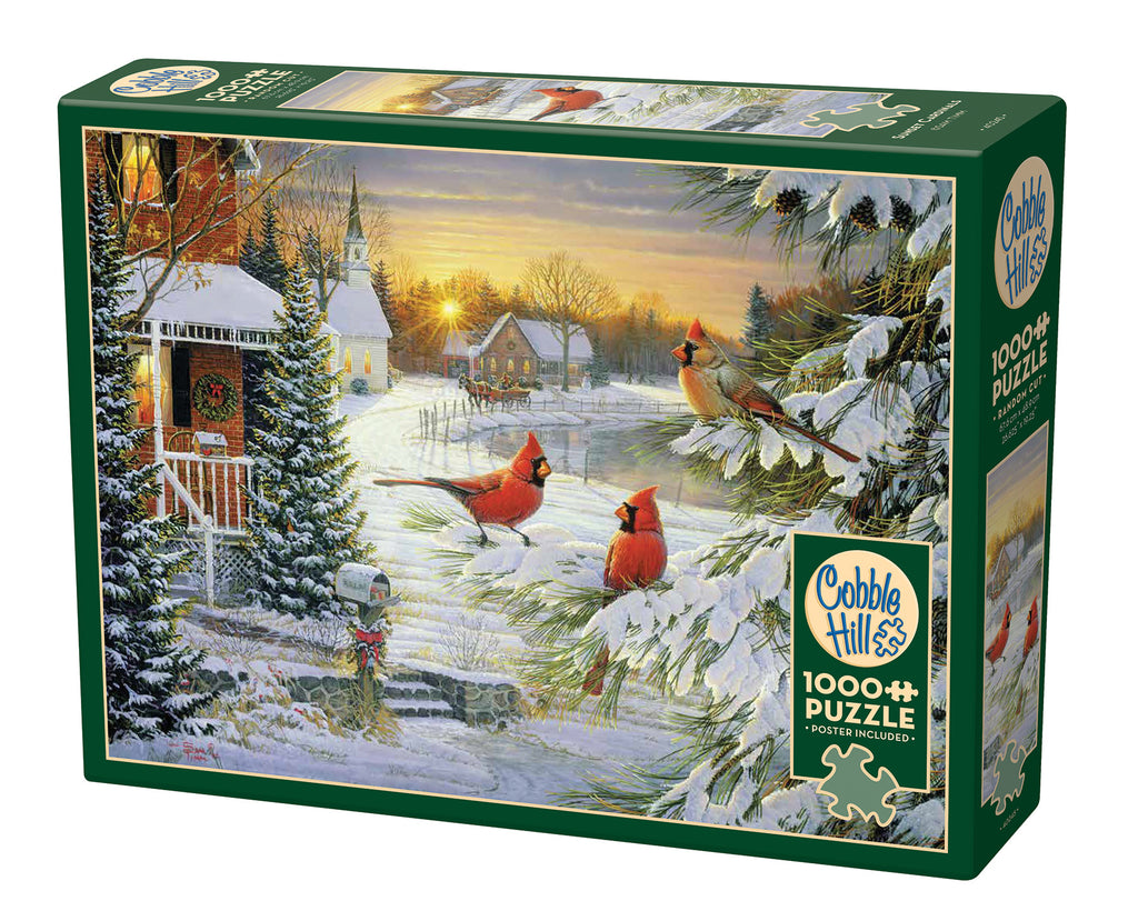 Le soleil se couche sur la maison de campagne et les cardinaux se rassemblent dans le pin. Ce puzzle de 1 000 pièces, intitulé « Cardinaux au coucher du soleil », porte bien son nom. Les puzzles Cobble Hill proposent des pièces aux formes aléatoires originales, ce qui rend chaque puzzle unique. Un poster pratique est inclus.