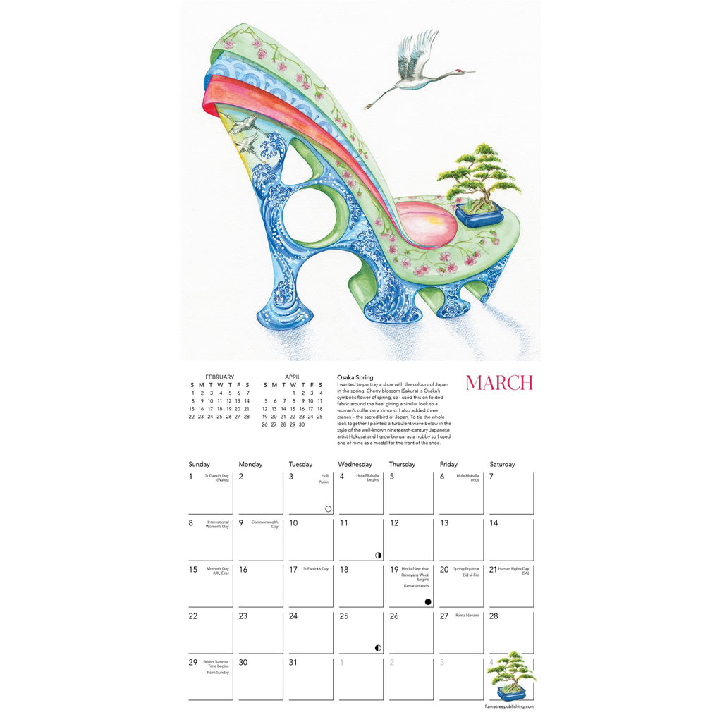 Sally King privilégie l'insolite et l'inattendu dans son art. Son travail vise à créer des visions surprenantes en combinant des objets et des environnements atypiques. Sa formation en mode, alliée à son imagination et à son talent graphique, lui permet de concevoir de merveilleuses créations à talons – des modèles d'apparence impossible, pourtant parfaitement portables et dignes des podiums. Ce mini calendrier mural présente une sélection de ses créations de chaussures fantastiques et originales. Le calendrier affiche les pages du mois précédent et du mois suivant. Imprimé sur du papier certifié FSC, emballage sans plastique.