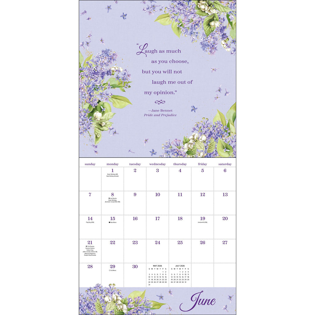 Le calendrier mural Jane Austen 2026, orné de citations inspirantes, embellira votre intérieur et égayera votre quotidien. Son texte, typiquement Jane Austen, propose des citations célèbres extraites de ses romans, illustrant son humour subtil et offrant un regard moderne. Idéal pour les amoureux de la littérature classique, les cinéphiles, les anglophiles et les admirateurs des illustrations de Marjolein Bastin. Caractéristiques : 30,5 x 30,5 cm (30,5 x 61 cm ouvert). Couverture sans emballage plastique. Imprimé sur papier certifié FSC® avec des encres à base de soja. Planification de septembre à décembre 2025. Couvre janvier à décembre 2026. Grand espace pour vos notes, rendez-vous et rappels. Jours fériés et commémorations officiels. Phases de la lune (UTC). Citations spirituelles tirées des romans de Jane Austen, accompagnées d'illustrations florales de l'artiste naturaliste néerlandaise Marjolein Bastin.