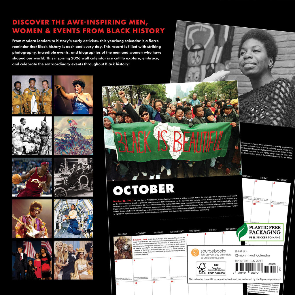 Découvrez les hommes, les femmes et les événements marquants de l'histoire des Noirs dans cet incroyable calendrier mural 2026 ! Ce magnifique calendrier, source d'inspiration, célèbre toute l'année les réussites et l'excellence des Noirs. Rempli de photographies saisissantes et de 365 jours d'anecdotes et de portraits inspirants, ce calendrier mural est une invitation à explorer, à s'approprier et à célébrer des événements mondiaux extraordinaires, nous rappelant avec force que l'histoire des Noirs s'écrit chaque jour. Ce calendrier historique arrive à point nommé, à une époque où les voix et les récits des Noirs sont plus que jamais nécessaires. Parfait pour les passionnés d'histoire et d'anecdotes, ce calendrier mensuel est le cadeau idéal pour les enseignants, les férus d'histoire (hommes et femmes), les fêtes de fin d'année, la fête des Pères, et pour tous ceux qui recherchent une réflexion authentique et profonde sur les moments qui ont marqué l'histoire des Noirs, hier comme aujourd'hui. - Calendrier mural historique de 12 mois (janvier-décembre 2026) avec 24 images exceptionnelles et une année d'événements fascinants de l'histoire des Noirs - Superbes photographies en couleur imprimées sur papier glacé de haute qualité - Format 30,5 x 30,5 cm avec un trou robuste pour une suspension facile et papier certifié FSC, respectueux de l'environnement - Espace suffisant chaque jour pour écrire et noter vos rappels, tâches et rendez-vous importants - Aperçu de l'année 2027 - Jours fériés et commémorations