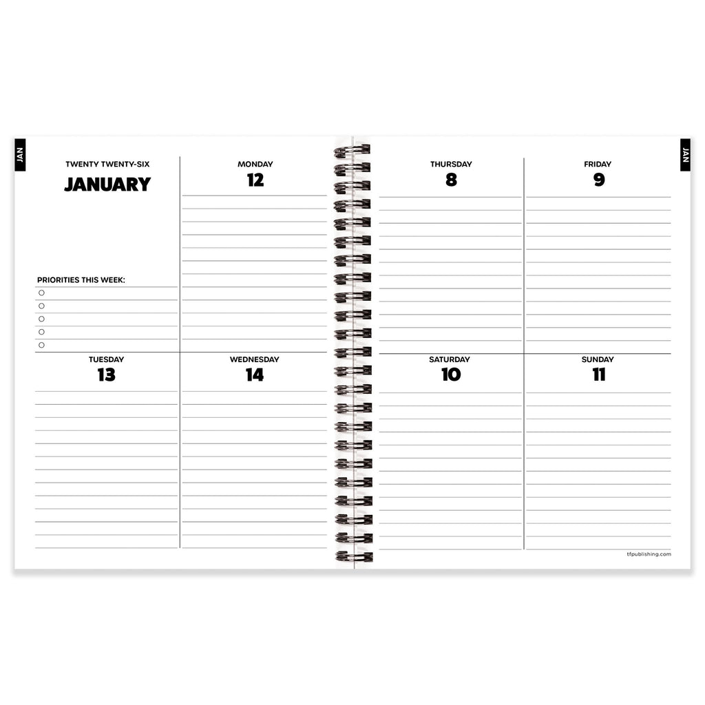 Tout va bien ! Gérez tout avec sérénité grâce à notre agenda 2026 orné en couverture du célèbre chien « This is Fine » de l'artiste renommé KC Green ! Mesurant 16,5 cm (l) x 20,3 cm (h), cet agenda complet de format moyen propose des doubles pages mensuelles avec des sections lignées pour vos notes, tâches et objectifs, ainsi que des doubles pages hebdomadaires avec des sections lignées pour une organisation optimale. Une section dédiée aux priorités hebdomadaires vous aidera à rester concentré(e). L'intérieur, au design épuré et raffiné, est agrémenté de faux onglets mensuels pour un accès facile à votre planning hebdomadaire. Personnalisez votre agenda avec 216 stickers de couleurs assorties pour mettre en valeur les occasions spéciales. Des pages de notes lignées supplémentaires se trouvent à la fin, tandis que les vues annuelles 2026 et 2027 sont présentées au début. Doté d'une couverture résistante et d'une reliure spirale noire permettant une ouverture à plat, cet agenda de 12 mois couvre la période de janvier à décembre 2026 et est sans plastique. Des produits sans culpabilité ! Imprimés sur du papier certifié FSC.