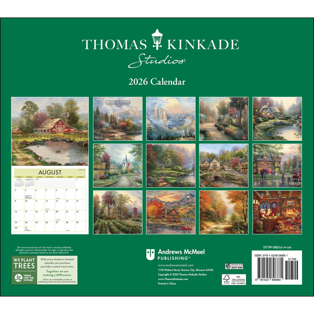 Thomas Kinkade Studios perpétue l'héritage de l'artiste en créant et en partageant de magnifiques images qui évoquent la paix, l'inspiration et la gratitude, nous rappelant l'importance du foyer, de la famille et des lieux et choses qui nous apportent de la joie. Ce calendrier présente une sélection de peintures classiques et contemporaines, telles que « Yosemite Valley », « Cobblestone Lane », « Hometown Afternoon » et « A Perfect Fall Day ». Caractéristiques : 34,3 cm x 30,5 cm (34,3 cm x 61 cm ouvert). Enveloppe assortie sans plastique. Imprimé sur du papier certifié FSC® avec de l'encre à base de soja. Planification de septembre à décembre 2025. Couvre également les mois de janvier à décembre 2026. Grand espace quadrillé pour les événements, les rendez-vous et les rappels. Zone lignée pour les notes chaque mois. Jours fériés et commémorations officiels dans le monde. Phases de la lune, selon le Temps Universel. Images tirées des paysages de Thomas Kinkade Studios.