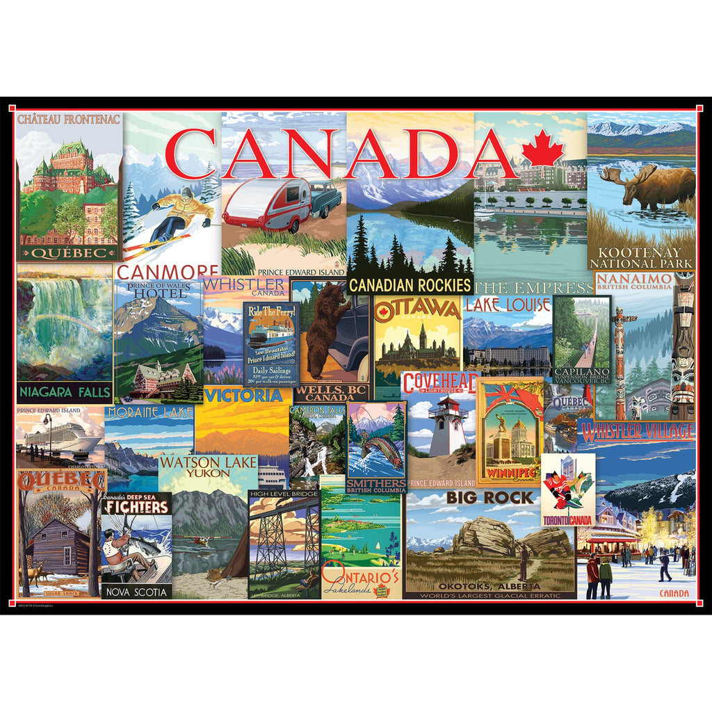 Puzzle 1000 pièces EuroGraphics « Affiches vintage de voyage au Canada ». Dimensions de la boîte : 25,4 cm x 35,6 cm x 6 cm. Dimensions du puzzle terminé : 48,9 cm x 67,3 cm. Ô Canada ! Votre passeport pour le meilleur du Canada en un seul puzzle : plus de 40 destinations à découvrir. Ce puzzle de 1000 pièces vous donnera assurément envie de voyager ! Pièces de puzzle robustes et de haute qualité. Fabriqué à partir de carton recyclé et imprimé avec des encres végétales.