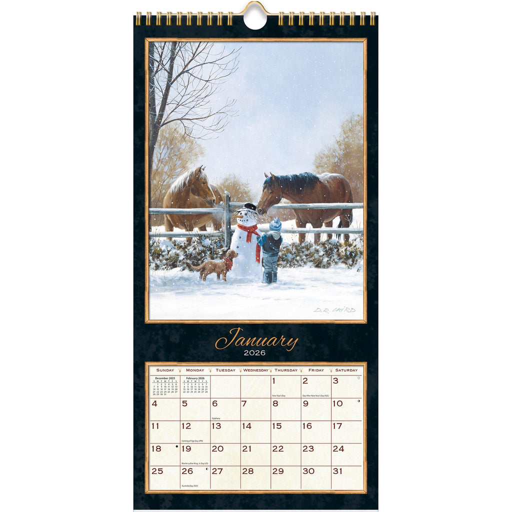 Grâce à son format plus étroit et à sa conception compacte, le calendrier mural vertical Treasured Times 2026 trouvera facilement sa place dans les coins de bureau ou les petits espaces de la maison. Orné d'illustrations de DR Laird, imprimé sur un papier de qualité gaufré lin, accompagné d'un étui cadeau assorti et relié par une spirale avec crochet, ce calendrier mensuel est un cadeau idéal à s'offrir ou à offrir à un être cher.