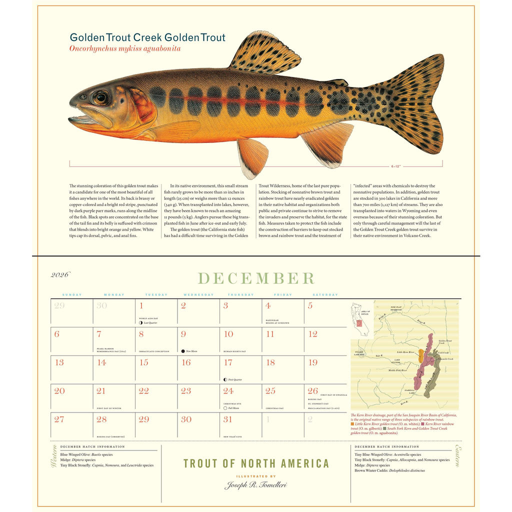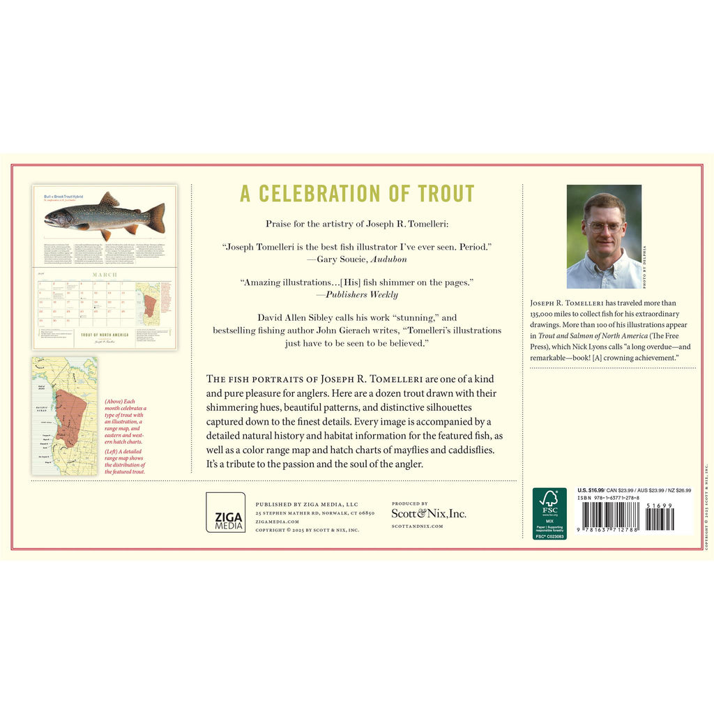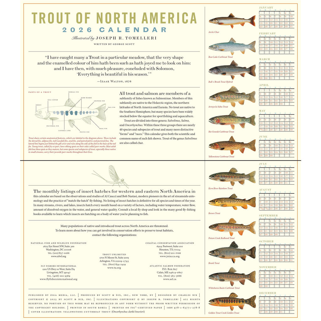L'ouvrage « Truites d'Amérique du Nord 2026 » présente douze mois d'illustrations exceptionnelles de truites, réalisées avec une précision et une finesse remarquables par le célèbre artiste naturaliste Joe Tomelleri : des truites si réalistes qu'elles semblent sortir des pages. Ces portraits de poissons plus vrais que nature sont accompagnés de cartes de répartition, de tableaux d'éclosion des mouches et d'une fiche descriptive sur l'histoire naturelle des espèces présentées. Conçu par Scott & Nix, c'est le cadeau idéal pour les pêcheurs, les sportifs et les amoureux de la nature.