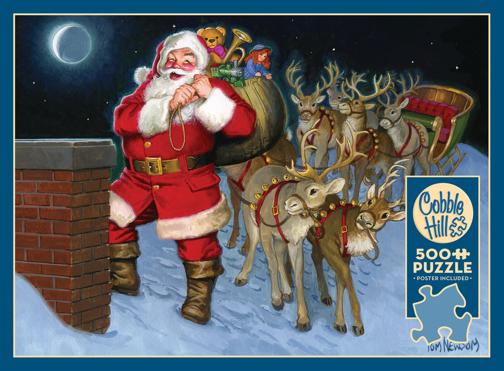 C'est Noël ! Le Père Noël et ses fidèles rennes ont atterri sur le toit, prêts à descendre par la cheminée avec leur hotte pleine de jouets pour les petits garçons et les petites filles. La neige sur le toit ne dérange pas les rennes, qui patienteront sous le clair de lune. Avec le ciel nocturne et la cheminée, ce puzzle de 500 pièces sera un vrai défi à assembler. Les puzzles Cobble Hill proposent des pièces aux formes variées et originales, ce qui les rend toutes uniques. Un poster pratique est inclus.