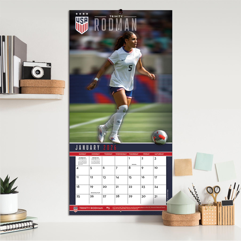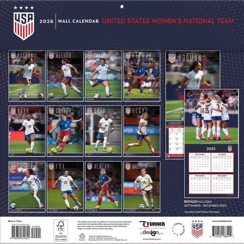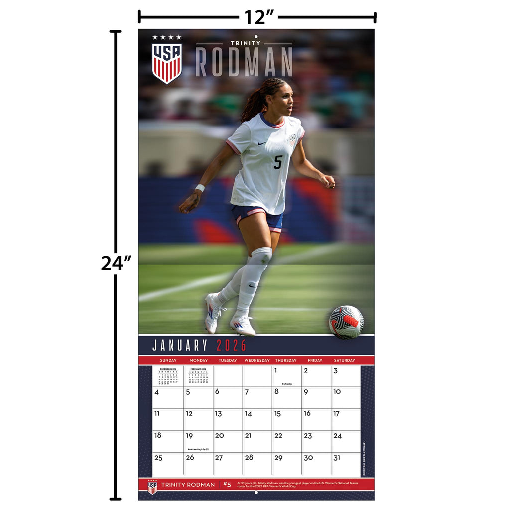 Conçu pour les fans inconditionnels de l'équipe nationale féminine américaine (USWNT), ce calendrier mural présente chaque mois des photos grand format de vos joueuses préférées ! Découvrez également la biographie de chaque joueuse et de nouveaux visuels aux couleurs et logos de l'équipe. D'une qualité exceptionnelle, ce calendrier 30 x 30 cm inclut des pages bonus reprenant les résultats de septembre à décembre 2025. Format 12 mois (janvier à décembre 2026). Dimensions : 30,5 cm (largeur) x 61 cm (hauteur) (ouvert).