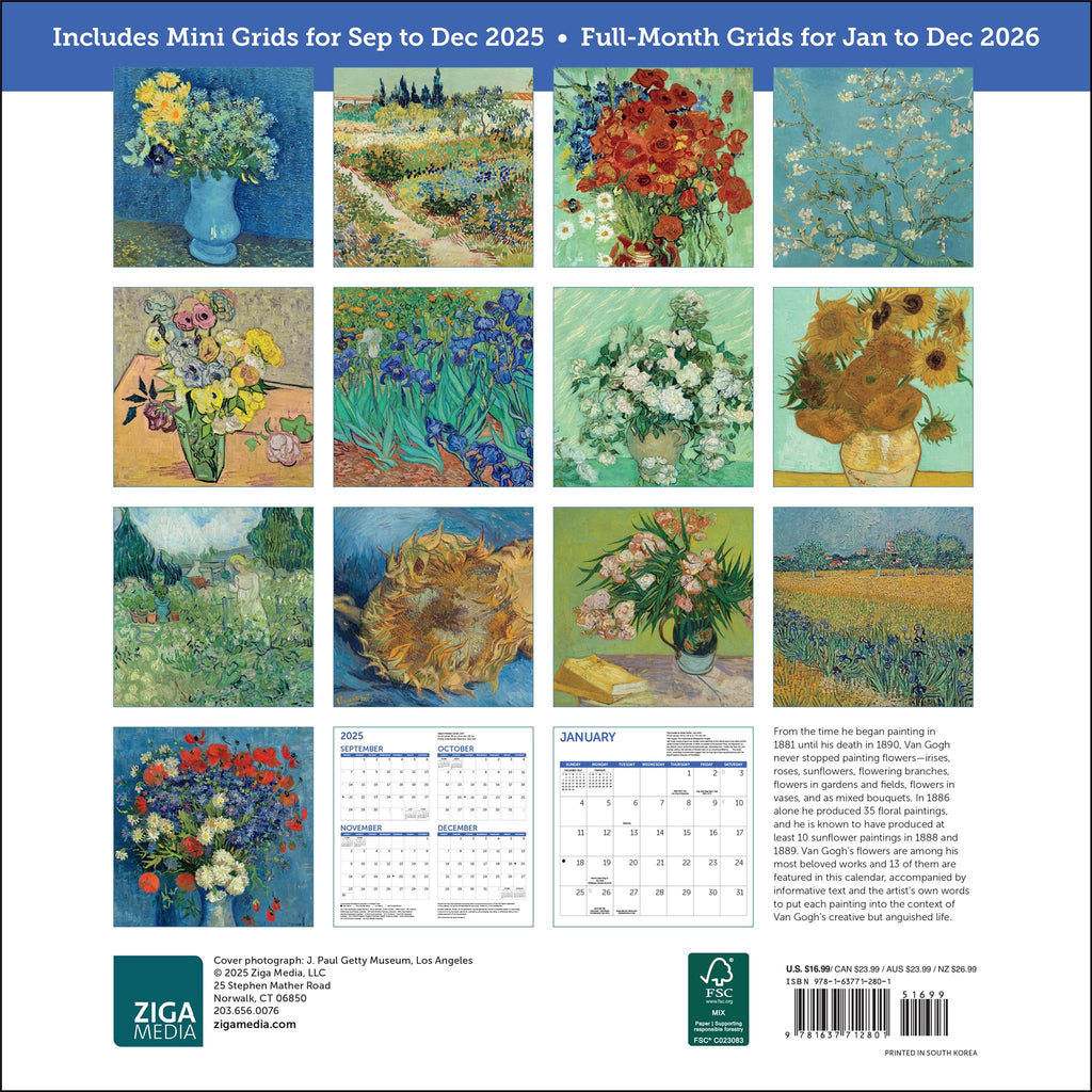 « J’y travaille chaque matin dès l’aube, car les fleurs se fanent si vite, et l’important est de tout peindre d’un seul trait », écrivait Vincent Van Gogh. De ses débuts en 1881 jusqu’à sa mort en 1890, Van Gogh n’a jamais cessé de peindre des fleurs : iris, roses, tournesols, branches fleuries, fleurs de jardins et de champs, fleurs en vases et en bouquets. Rien qu’en 1886, il a réalisé 35 tableaux de fleurs, et on sait qu’il a peint au moins 10 tournesols en 1888 et 1889. Les fleurs de Van Gogh comptent parmi ses œuvres les plus appréciées, et 13 d’entre elles sont présentées dans ce calendrier, chacune accompagnée d’un texte explicatif.