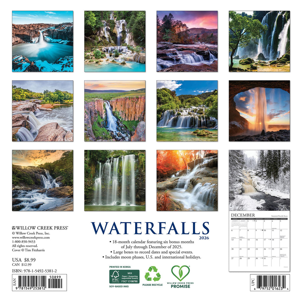 Ces douze magnifiques images de cascades, de bassins naturels et de verdure luxuriante offrent une sérénité si souvent absente de nos vies trépidantes. Organisez-vous et planifiez l'avenir avec le mini calendrier mural 2026 de Willow Creek Press. Avec suffisamment d'espace pour vos notes et événements, ce calendrier de 18 x 18 cm vous aidera à respecter vos engagements et à optimiser votre productivité pour l'année à venir. Atteignez vos objectifs grâce à ce calendrier fiable. DES IMAGES ÉPOUSTOUFLANTES - Les calendriers présentent de superbes images réalisées par les plus grands photographes et artistes du monde. QUALITÉ SUPÉRIEURE - Papier de haute qualité qui reste bien à plat une fois accroché et offre des couleurs nettes et éclatantes. VUE D'ENSEMBLE MENSUEL - Planifiez à l'avance ou consultez les mois précédents et à venir en un coup d'œil. ÉCOLOGIQUE - Les calendriers Willow Creek Press sont imprimés sur du papier certifié FSC avec des encres à base de soja. FONCTIONNALITÉS SUPPLÉMENTAIRES - Jours fériés américains et internationaux et phases de la lune (heure centrale) indiqués pour chaque mois pour un suivi facile. LE CADEAU IDÉAL - Un cadeau parfait pour toutes les occasions : notre sélection de calendriers saura satisfaire tous les goûts. Avec un tel choix, vous trouverez assurément le calendrier idéal pour vos amis et votre famille.