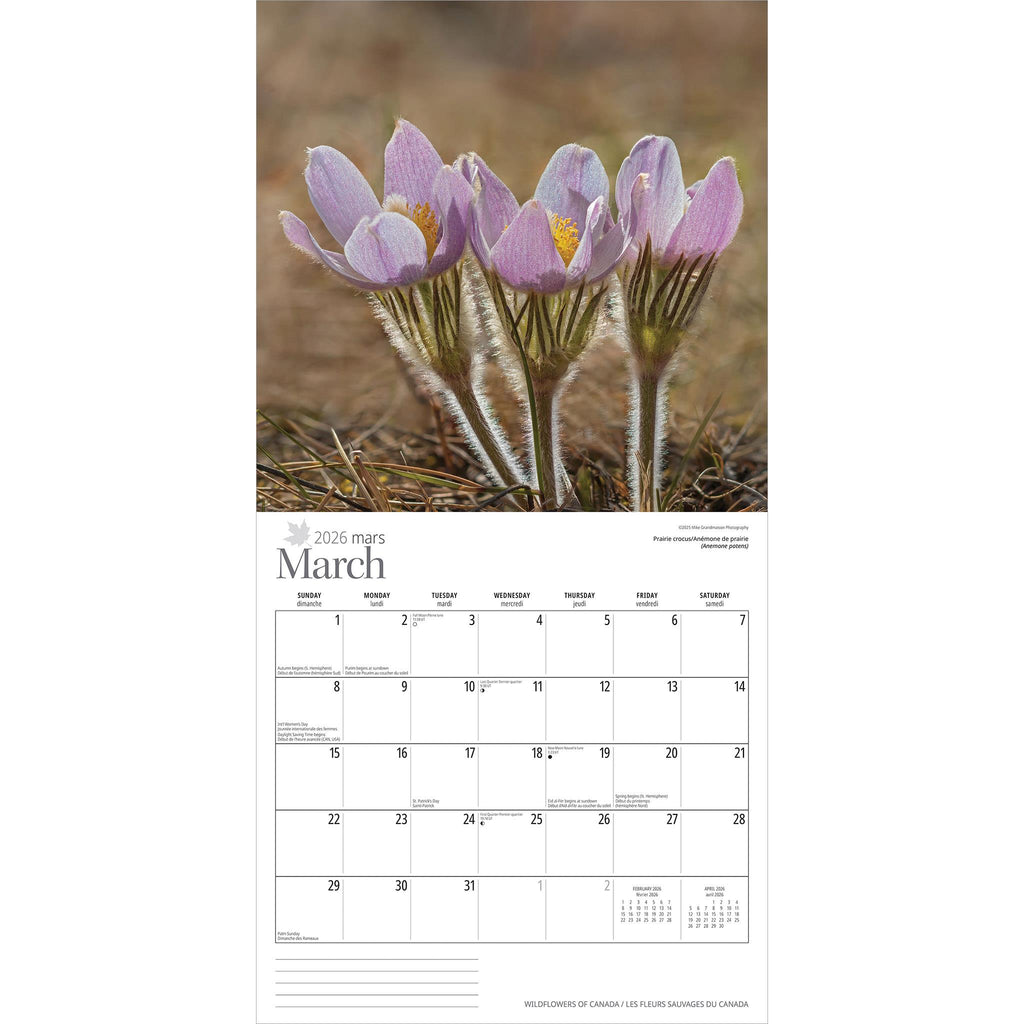Partez pour une promenade virtuelle à travers les prairies de montagne, les forêts denses et luxuriantes et les vastes étendues herbeuses, et laissez-vous émerveiller par la beauté, la force et la ténacité des nombreuses fleurs sauvages d'Amérique du Nord. Ce calendrier mural carré est bilingue (anglais, français).
