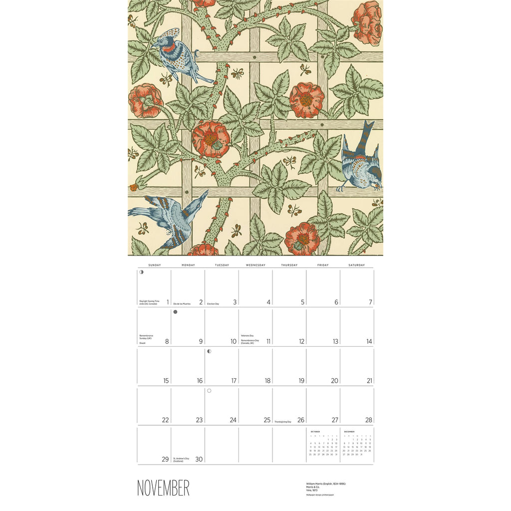 Figure de proue de la mode et de la politique de son époque, William Morris considérait ses motifs à la fois comme une forme d'art et un moyen d'expression sociale. En réaction aux productions industrielles de l'ère de la machine, lui et ses collègues de Morris & Co. – dont certaines créations figurent également dans ce calendrier – ont imaginé des papiers peints et des tissus ornés de motifs floraux naturels et témoignant d'un savoir-faire artisanal. Leur travail et leurs idées ont inspiré de nombreux artistes, donnant naissance au mouvement Arts and Crafts. Les motifs botaniques complexes de leurs créations, dont douze sont présentés ici, vous invitent à un moment de calme et de contemplation au cœur d'une journée trépidante.