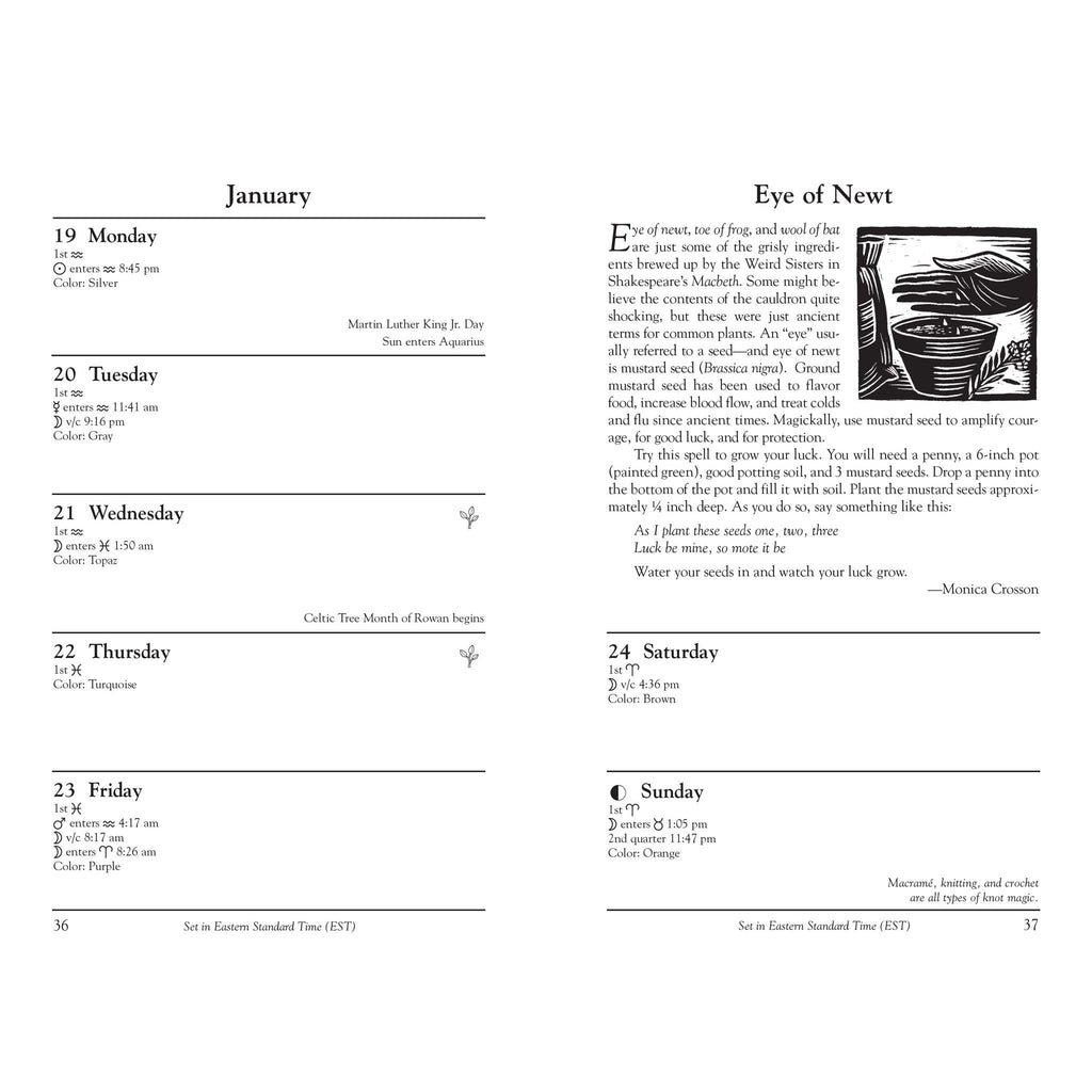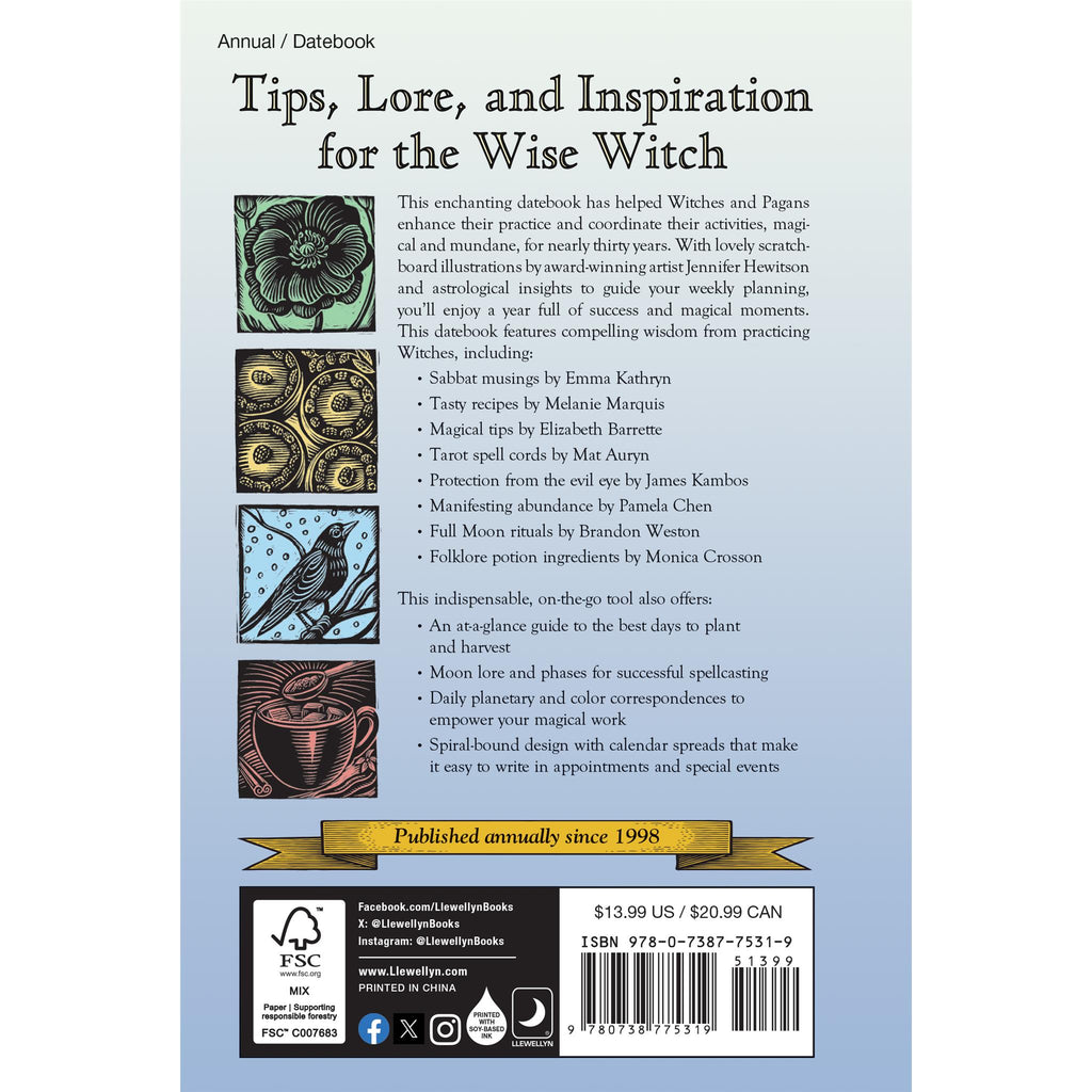 Célébrez la magie au quotidien avec cet agenda pratique. Organisez votre vie personnelle, professionnelle et spirituelle avec l'Agenda des Sorcières 2025 de Llewellyns. Illustré par l'artiste primée Jennifer Hewitson, cet agenda populaire propose des idées originales pour célébrer les énergies saisonnières, ainsi que de précieux conseils de sorcières renommées : réflexions sur les sabbats par Diana Rajchel, recettes savoureuses de Dawn Hunt et astuces magiques d'Elizabeth Barrette. L'utilisation des signes du zodiaque en magie par Ivo Domínguez Jr. Le folklore du lapin dans la sorcellerie régionale américaine par Via Hedera. Les mauvaises herbes du quotidien par Mhara Starling. La numérologie au fil de l'année par Charlie Rainbow Wolf. Conseils discrets pour les adeptes de la magie par Jason Mankey. Cet outil indispensable et nomade propose également : un guide pratique des meilleurs jours pour semer et récolter, les principes et les phases de la lune pour des rituels réussis, les correspondances planétaires et chromatiques quotidiennes pour optimiser votre pratique magique. Le tout est inclus dans un élégant carnet à spirale avec des pages de calendrier facilitant la prise de notes pour les rendez-vous et les événements spéciaux. Publié annuellement depuis 1998.