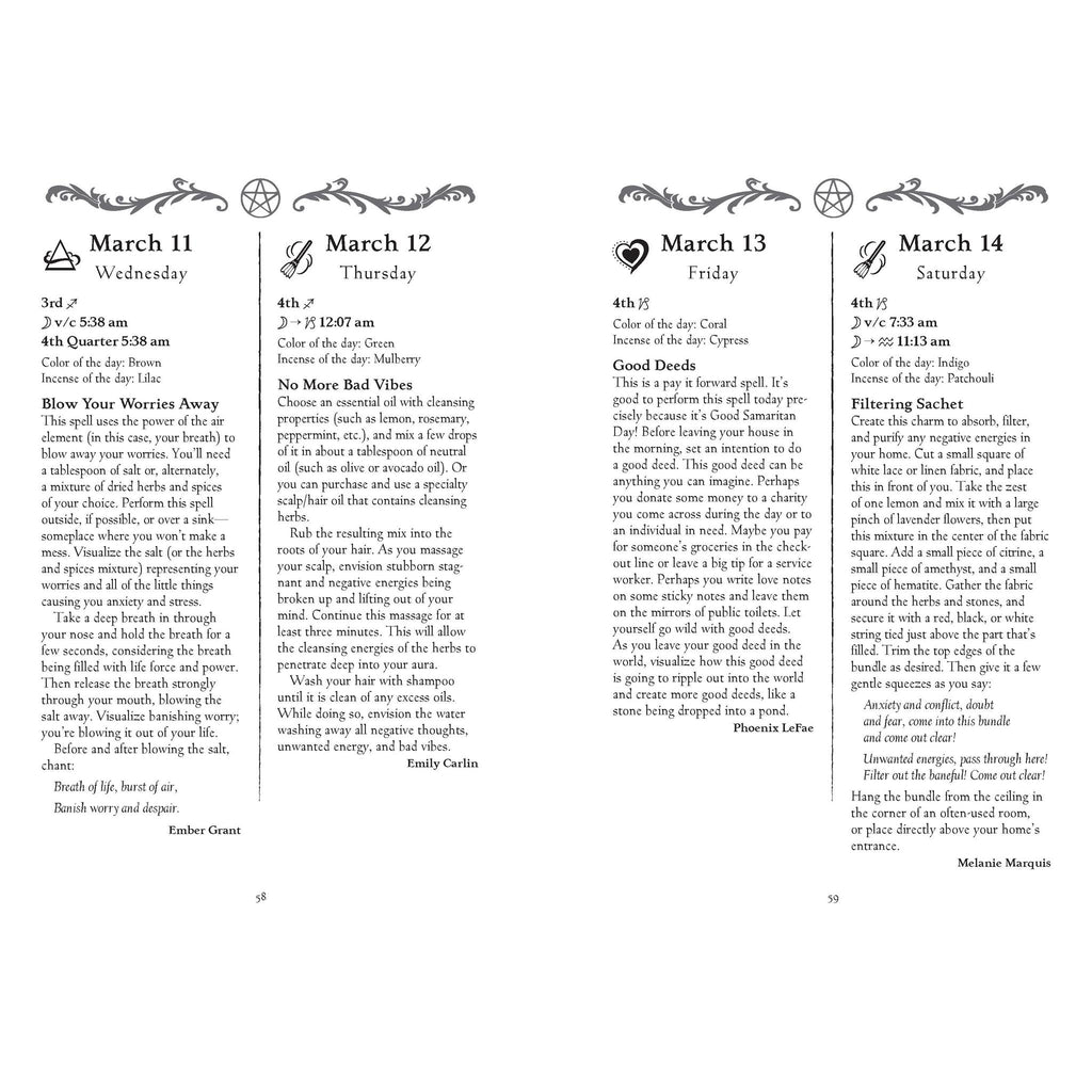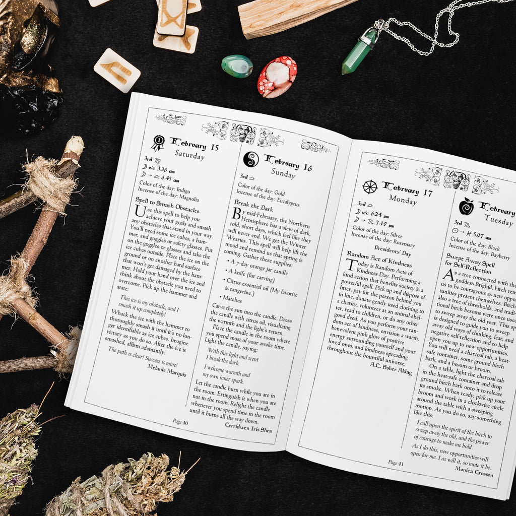 Un sort par jour pour chasser la monotonie. Lancez-vous dans une année passionnante, un sort à la fois, grâce à cette collection de nouveaux rituels, recettes et méditations. Conçus dans un souci de simplicité, la plupart des sortilèges ne requièrent que des outils et ingrédients simples, les rendant amusants et accessibles à tous, quel que soit votre niveau d'expérience. Les incantations de cette année sont sélectionnées par des praticiens de la magie renommés, tels que AC Fisher Aldag, Kerri Connor, Monica Crosson, Kate Freuler, James Kambos, Amanda Lynn, Melanie Marquis, Melissa Tipton, Charlynn Walls et Brandon Weston. Que vous recherchiez une dose quotidienne d'inspiration ou préfériez consulter le tableau de correspondance pour trouver des sorts spécifiques, l'Almanach des Sortilèges des Sorcières 2025 de Llewellyn vous aide à aborder magiquement les sujets essentiels pour une vie épanouie et agréable. Il propose des enchantements pour l'amour, la santé, l'argent, la protection, la maison et le jardin, les voyages et bien plus encore. Il comprend également des recommandations quotidiennes de couleurs et d'encens, les signes et phases de la lune, un glossaire de termes magiques, des traditions spécifiques à chaque mois et un espace pour les notes.