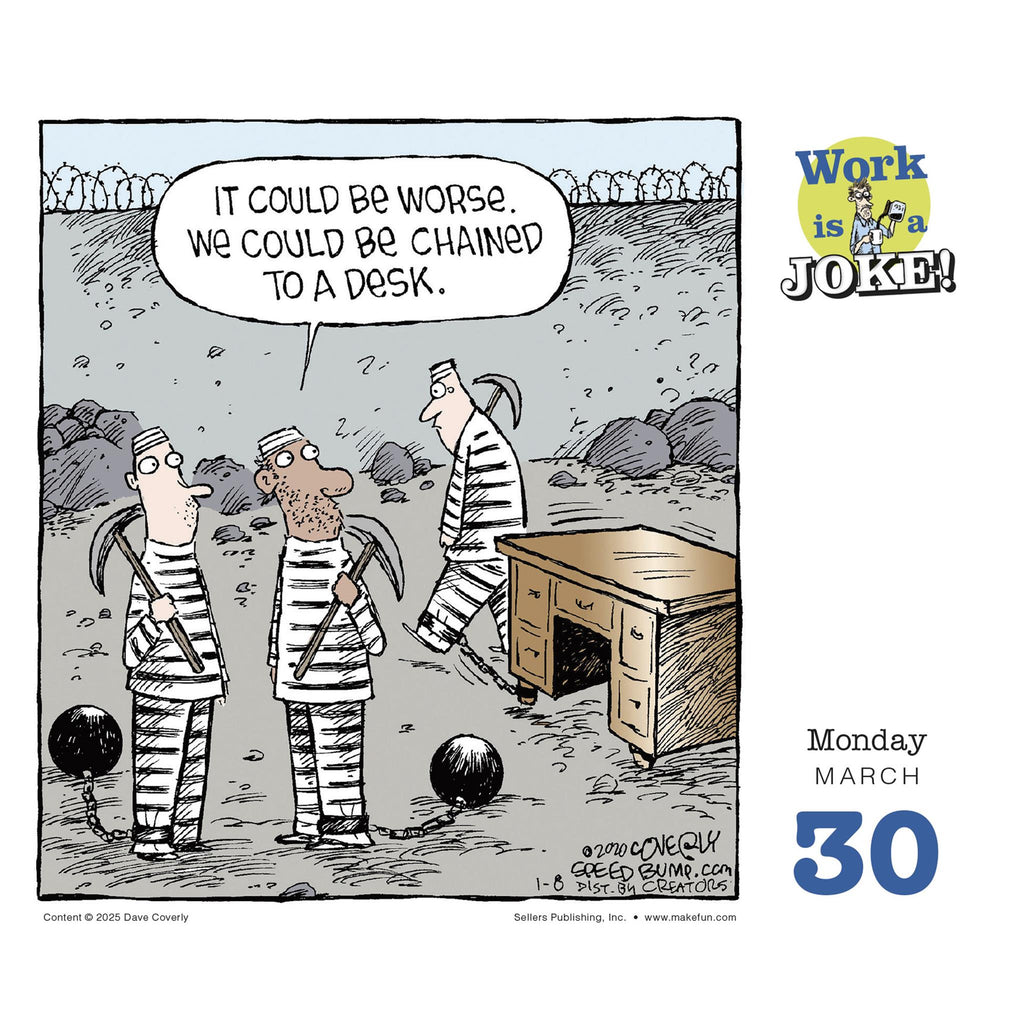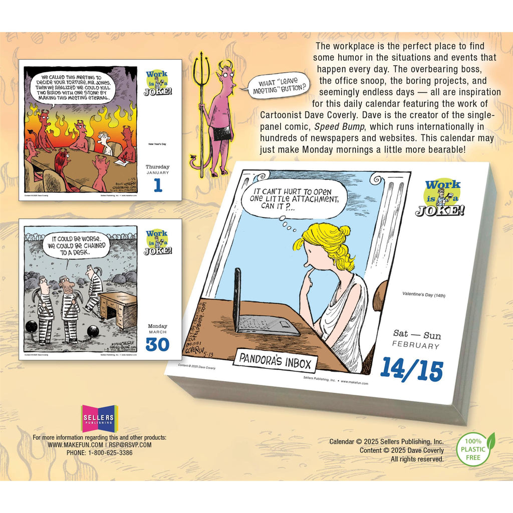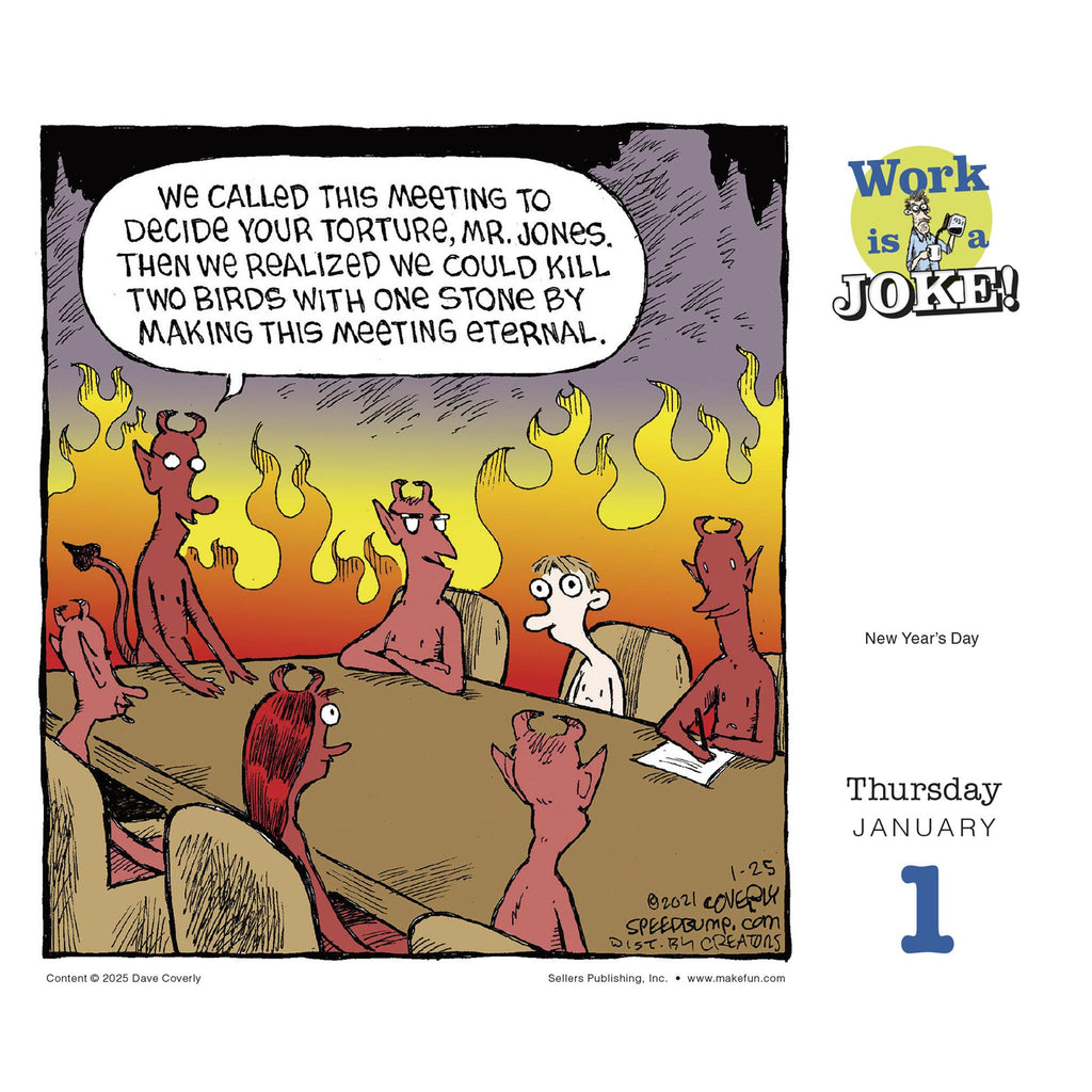 Le patron tyrannique, le fouineur du bureau et les journées interminables sont autant d'éléments qui ont inspiré ce calendrier. Dave Coverly est le créateur de la bande dessinée Speed Bump, diffusée dans le monde entier et composée d'une seule case. Voici ses dessins les plus drôles sur le monde du travail et les situations du quotidien. Les lundis matin seront peut-être un peu plus supportables désormais.