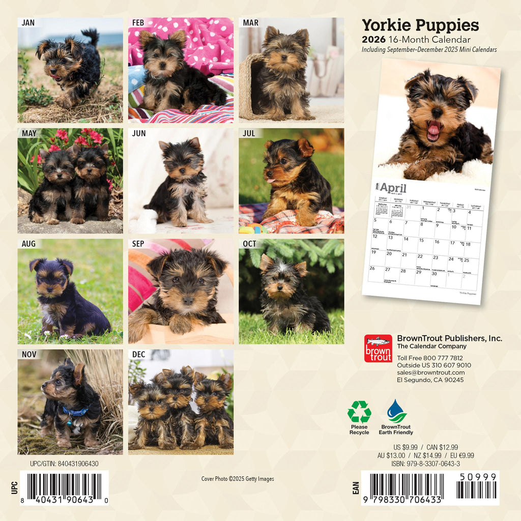 Adorables et déjà pleins d'énergie, les chiots Yorkshire Terrier débordent de vitalité. Ces petites boules de poils deviendront des compagnons affectueux et sûrs d'eux. Ramenez chez vous toute la joie de vivre des chiots Yorkie grâce à ce joli calendrier.